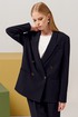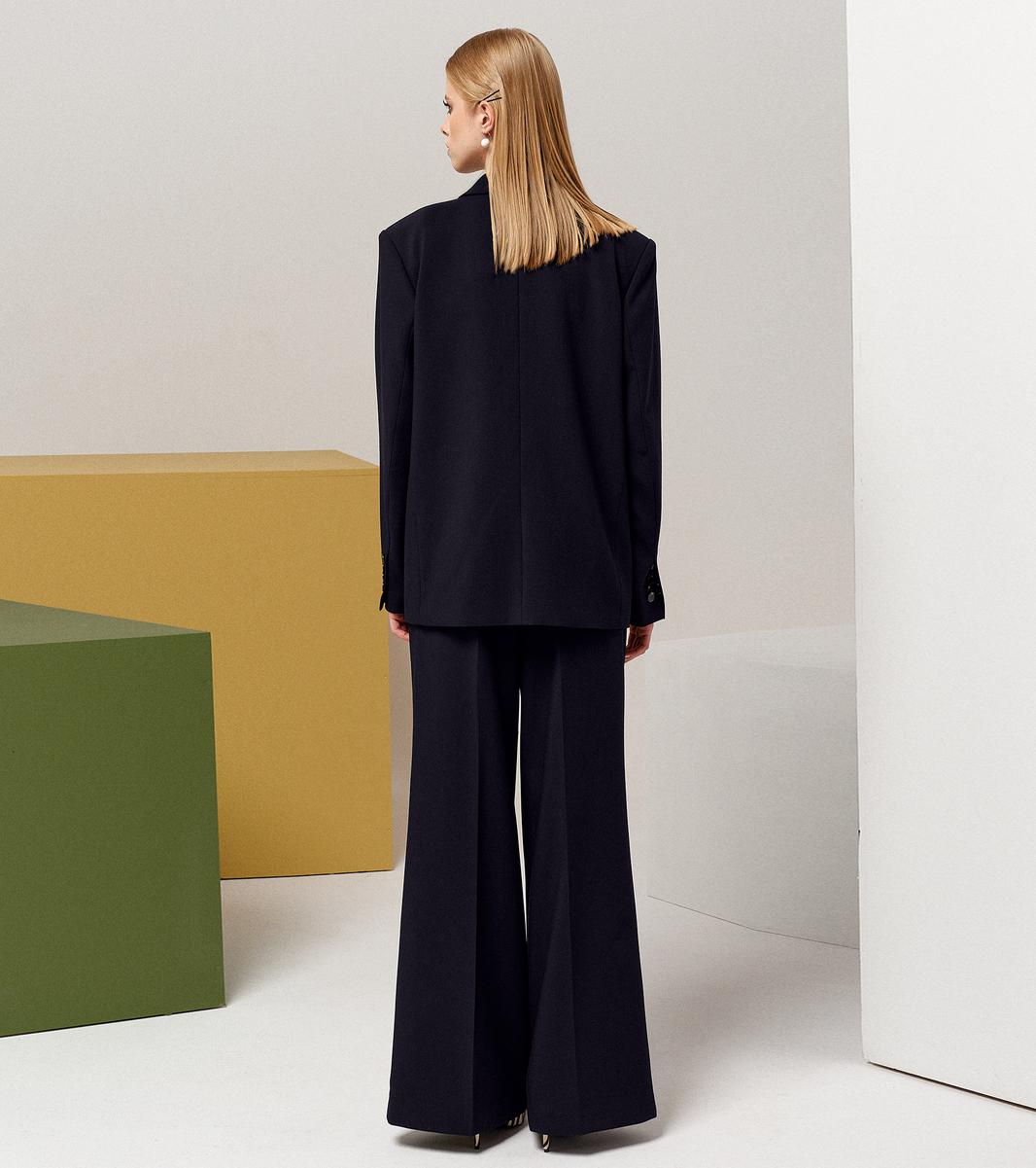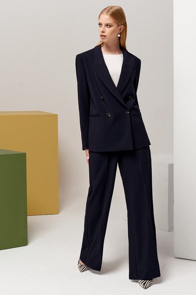 Удлиненный жакет прекрасно дополнит брюки в деловом стиле, уже имеющиеся в вашем арсенале модной одежды. Жакет женский оверсайз имеет достаточно свободный крой, не подразумевает посадку по фигуре. Вы можете носить деловой жакет как самодостаточный элемент, поддевая под низ нижнее белье, топ, однотонную футболку, майку. Двубортный жакет женский – отличный вариант. Поэтому он хорошо смотрится с узкими и широкими штанами. Выполнен жакет из трикотажа, хорошо держит форму. Вы можете купить черный классический пиджак по выгодной цене в размерах 42-50.