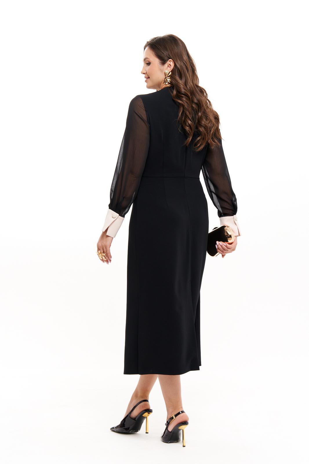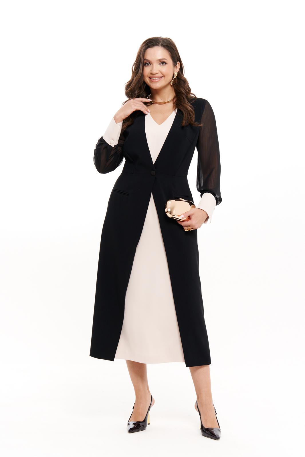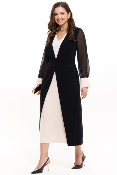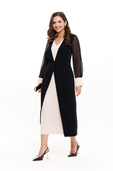 Женское нарядное платье— идеальный выбор для тех, кто ищет базовый элемент гардероба с элегантным классическим стилем. Это свободное платье с имитацией платья-жакета выполнено из струящейся ткани, придающей образу легкость и утонченность. Модель полуприлегающего силуэта отлично подходит как для повседневного ношения, так и для делового или офисного дресс-кода. Черно-бежевое сочетание делает платье нарядным и универсальным: вы можете надеть его как на деловую встречу, так и на вечерний выход. Летний и весенний сезоны — идеальное время для этого наряда, ведь он обеспечивает комфорт благодаря легким материалам и V-образной горловине. Рукава выполнены из шифона и дополнены манжетами с пуговицами, что добавляет женственности и изящества. Платье отрезное по талии, с вытачками и рельефами, подчеркивает силуэт, а скрытая застежка-молния делает посадку особенно аккуратной. Нижняя часть дополнена карманами и шлицей для удобства движений. Благодаря своей универсальности, это офисное платье также отлично впишется в повседневный гардероб современной женщины. Женское платье легко адаптируется под разные стили — от делового до нарядного, оставаясь при этом классическим и женственным. В нем вы всегда будете выглядеть актуально, уверенно и со вкусом.