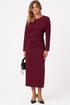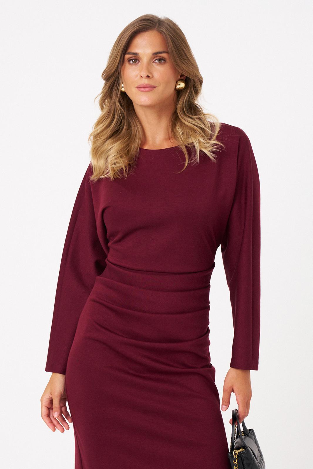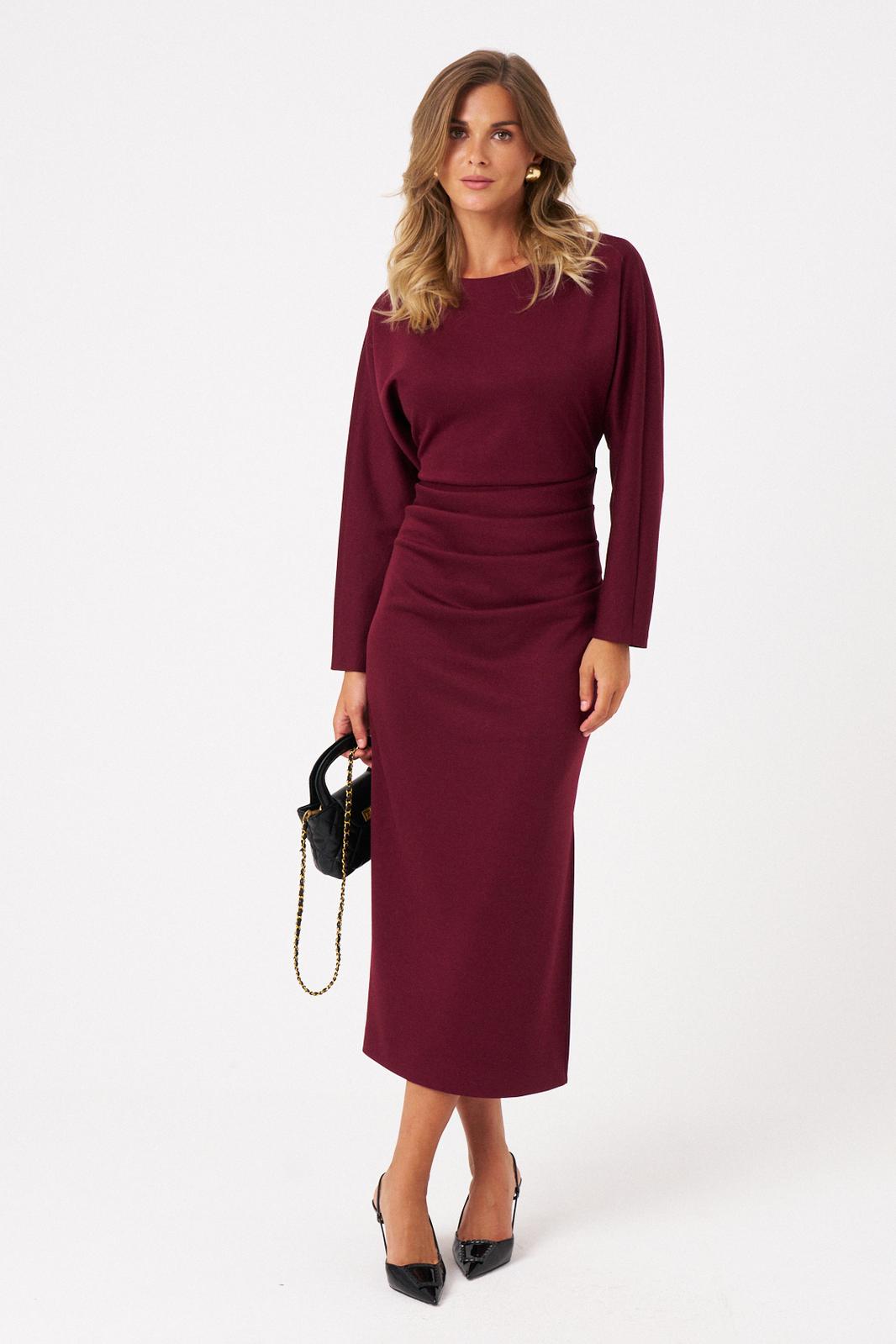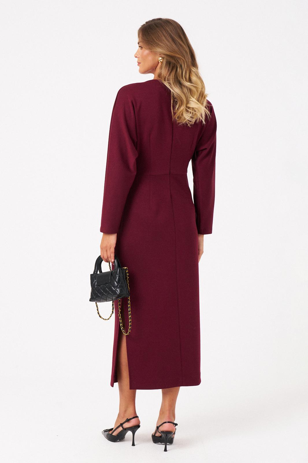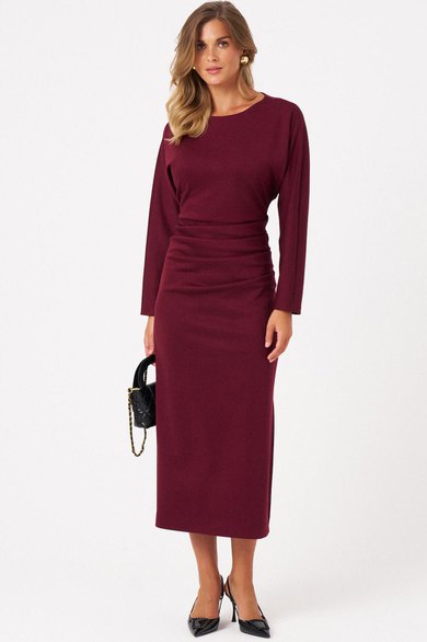 Женское платье из мягкого трикотажа идеально подойдет для повседневной носки. Модель отрезная по линии талии, что создает аккуратный и женственный силуэт. На переднем полотнище в боковом шве расположены защипы и разрез, добавляющие образу изящества и удобства. Спинка выполнена со средним швом и оснащена потайной застежкой-молнией в шве для комфортного надевания. Длинные цельнокроеные рукава обеспечивают дополнительный комфорт и стильный вид. Длина платья — макси, оно выполнено в бордовом оттенке, что делает его универсальным и легко сочетаемым с различными аксессуарами и обувью.