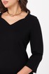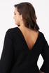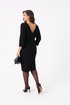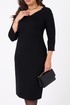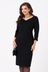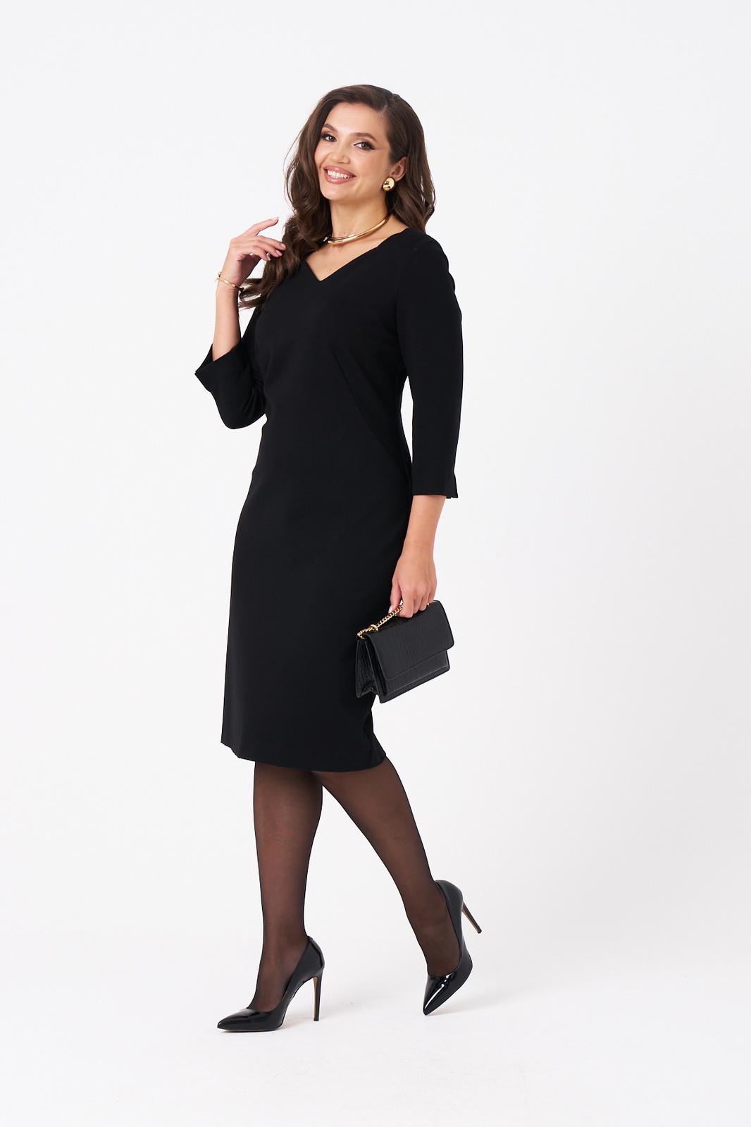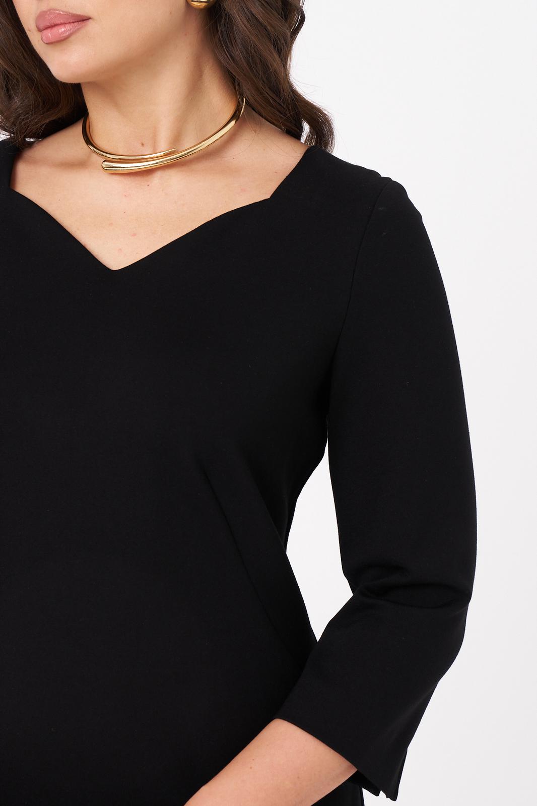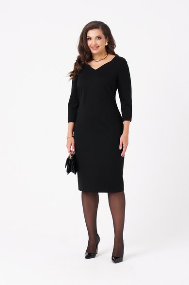 Женское платье из поливискозного трикотажного полотна черного цвета. Модель выполнена в миди-длине с V-образной горловиной по спинке. Перед платья украшен двумя талиевыми вытачками от боковых швов и двумя вытачками создавая вид сердцевидной горловины, что обеспечивает хорошую посадку и подчеркивает талию. Спинка оформлена с отрезной кокеткой и двумя складками для дополнительного объема, а также имеет средний шов с потайной молнией для застегивания. В нижней части спинки расположен разрез по среднему шву, добавляющий удобства при движении. Рукава втачные длиной чуть ниже локтя, по низу рукава по локтевому срезу имеется разрез, что создает комфорт и стильный внешний вид. Это универсальное платье предназначено для повседневной носки либо для различного рода мероприятий сочетает элегантность и практичность. При сочетании с аксессуарами вы получите новый образ.