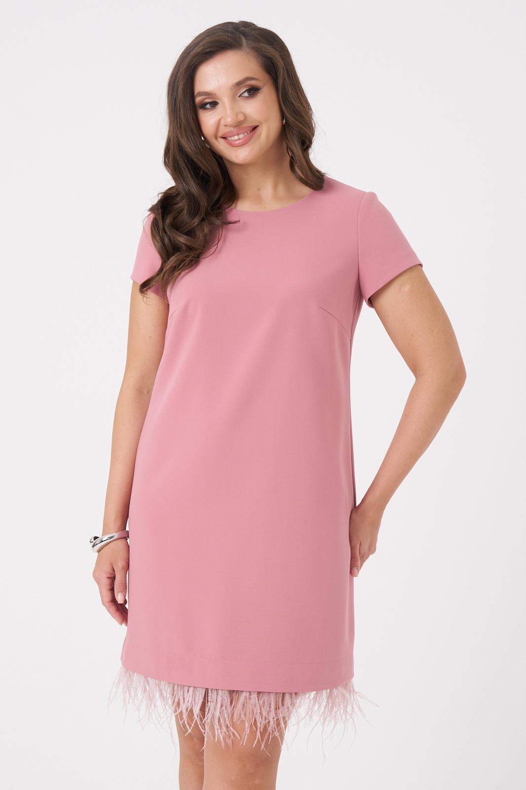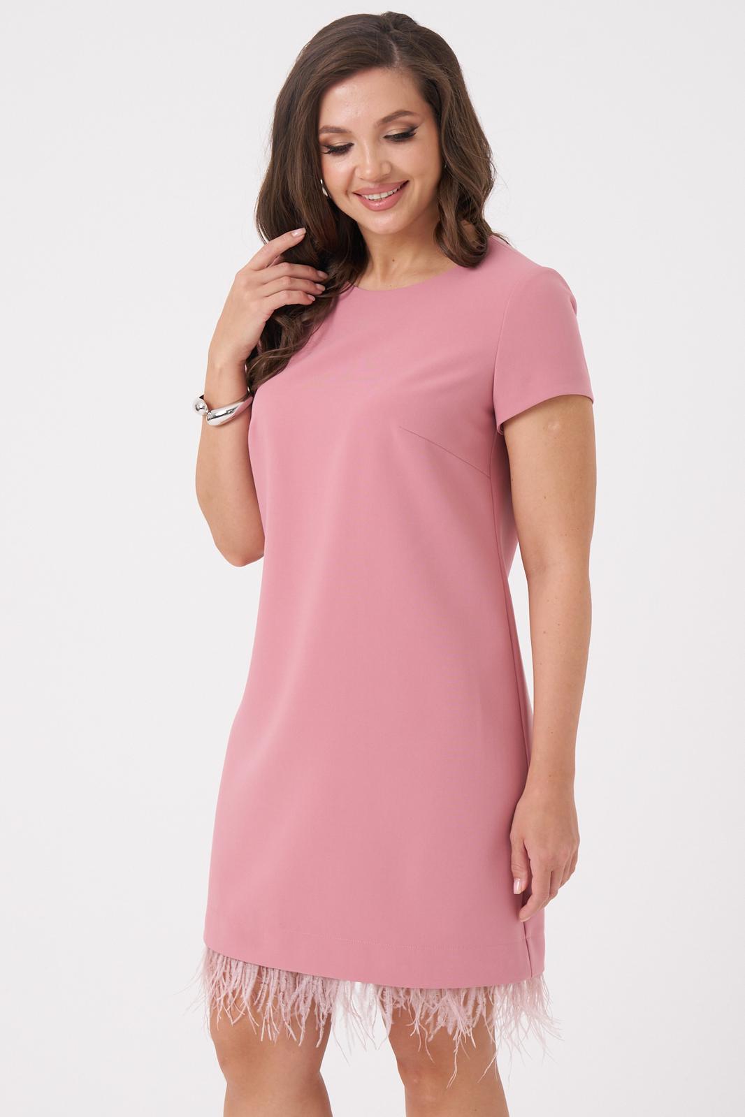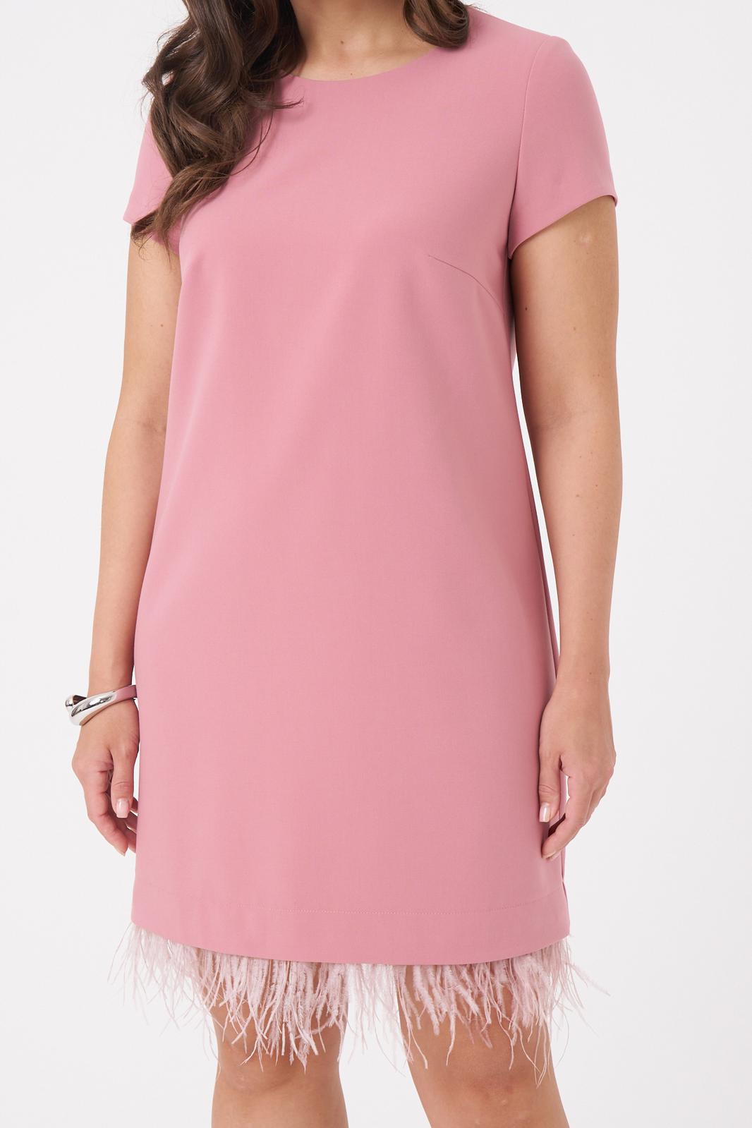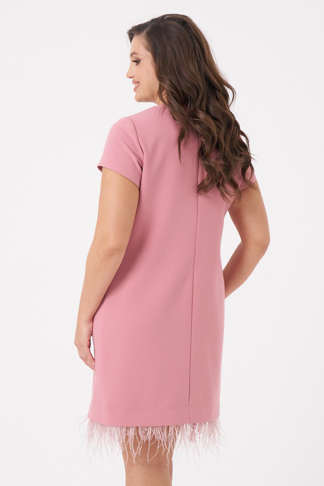 Это женское платье из поливискозной ткани, предназначенное для повседневной носки. Перед имеет две нагрудные вытачки, что придает изделию аккуратный и стройнящий силуэт. Спинка выполнена со средним швом и оснащена потайной застёжкой-молнией в шве для удобства надевания. Нижняя часть платья украшена декоративными перьями, добавляющими оригинальности и изящества образу. Перья крепятся на тесьму с кнопками, что позволяет отстёгивать их перед стиркой либо носить платье без них. Горловина, расширенная создает комфортное облегание и стильный вид. Короткие втачные рукава с фигурным низом делают платье практичным и легким в носке. Платье тёмно-розового цвета подхойдёт для различных случаев.