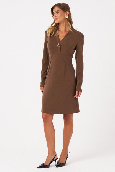 Женское платье из мягкого вискозного трикотажного полотна выполнено в стиле с расширением к низу, что обеспечивает комфортную и женственную посадку. Модель выполнена в коричневом оттенке и имеет длину миди. Перед отрезной чуть выше линии талии, с двумя нагрудными вытачками, подчеркивающими линию груди. Юбка переда украшена двумя складками, добавляющими объем и изящность силуэту. Спинка с средним швом и двумя талиевыми вытачками обеспечивает хорошую посадку и комфорт. V-образная горловина обработана планкой, что придает образу элегантность. Длинные втачные рукава дополняют стильный и практичный дизайн платья. В комплект входит декоративная брошь, которая позволяет дополнительно подчеркнуть индивидуальность образа. Это универсальное платье отлично подойдет для повседневных выходов и легко сочетается с различными аксессуарами и обувью.