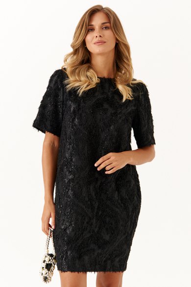 Женское платье из поливискозной ткани с фактурой «травка» предназначено для повседневной носки. Модель выполнена прямого силуэта, что обеспечивает комфорт и свободу движений. На передней части платья расположены две нагрудные вытачки, придающие изделию аккуратную посадку по фигуре. Спинка имеет средний шов, застежку «капельку» и небольшой разрез для удобства при ходьбе. Платье полностью на поливискозной подкладке, что повышает комфорт при носке. Расширенная горловина и короткие втачные рукава дополняют образ, придавая ему лёгкость и элегантность. Длина платья — миди, цвет — классический чёрный, что делает модель универсальной и подходящей для различных повседневных ситуаций.