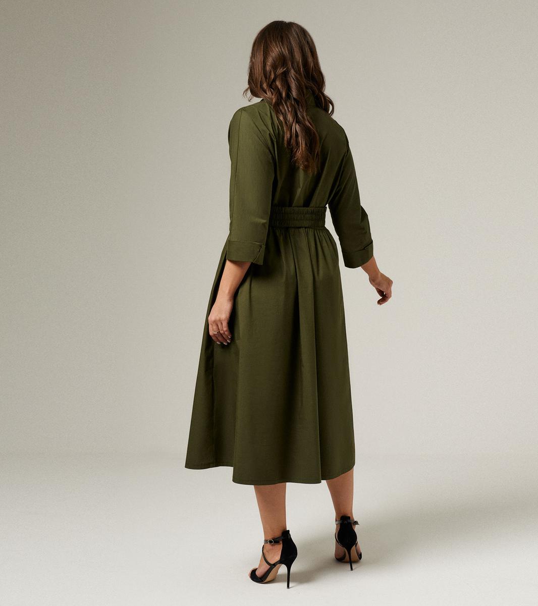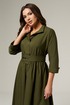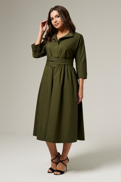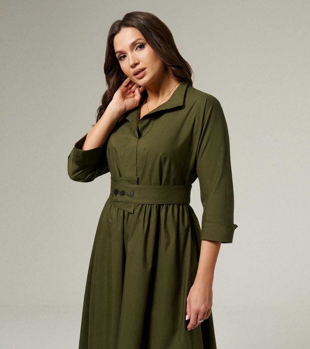 Платье женское из хлопковой ткани для повседневной носки. Без подкладки. Платье полуприлегающего силуэта. Длина изделия ниже колена. В боковых швах прорезные карманы. Рукав три четверти с манжетой. Платье укомплектовано поясом из основной ткани изделия.