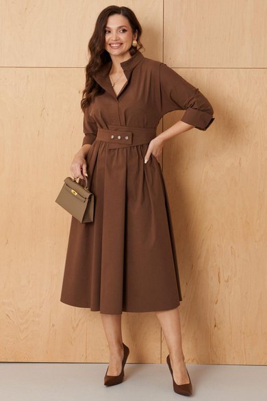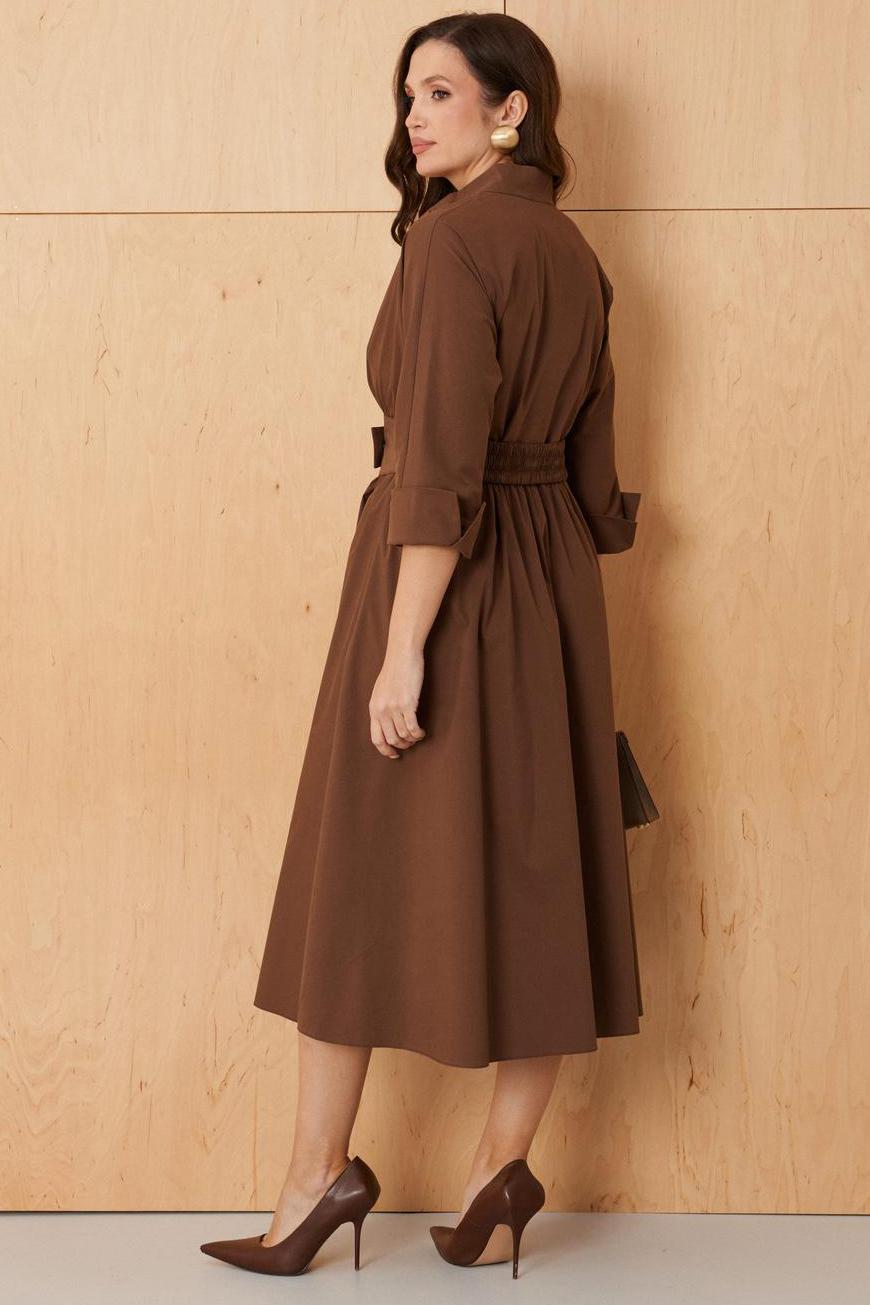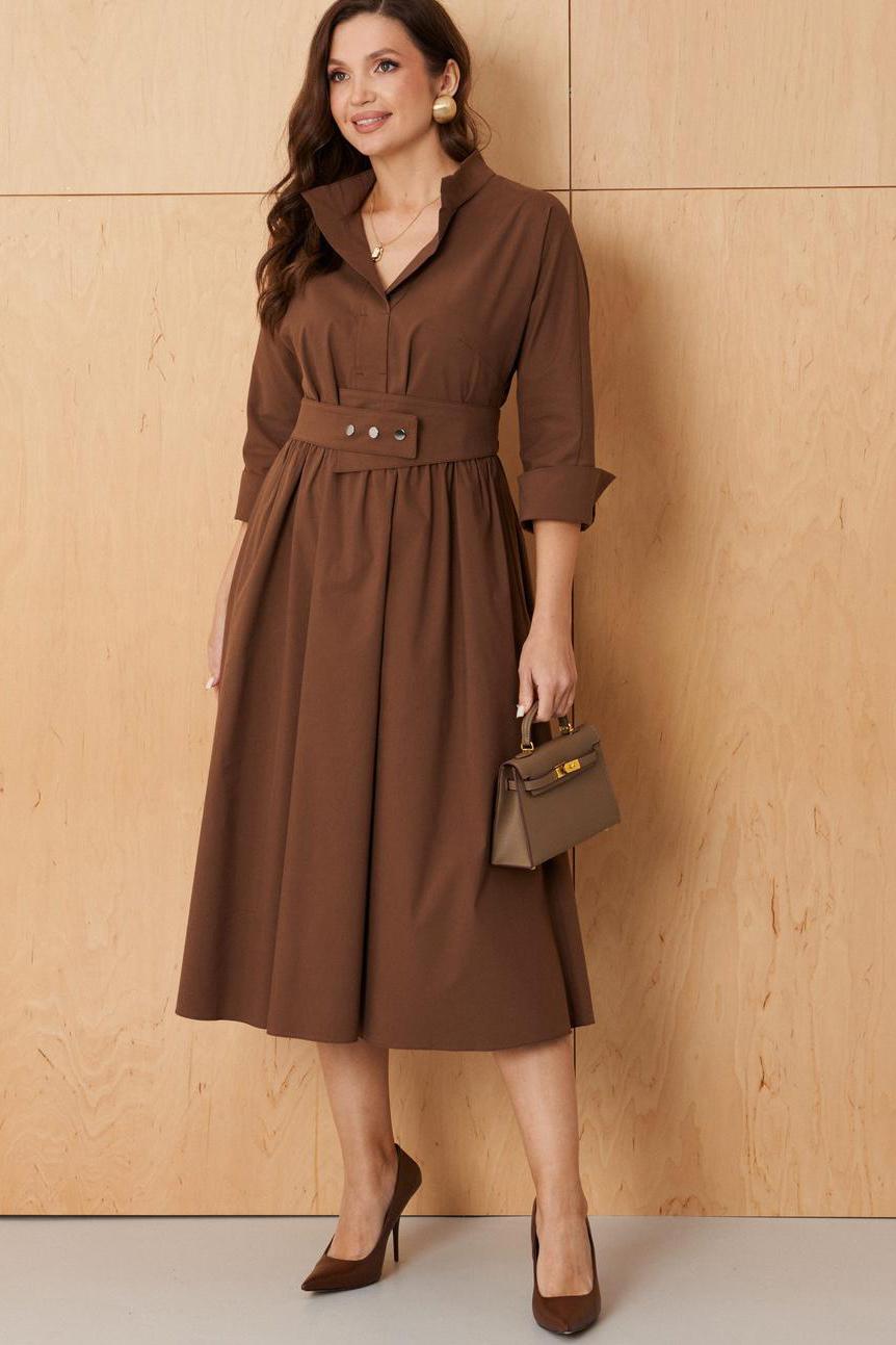 Платье женское из хлопковой ткани для повседневной носки. Без подкладки. Платье полуприлегающего силуэта. Длина изделия ниже колена. В боковых швах прорезные карманы. Рукав три четверти с манжетой. Платье укомплектовано поясом из основной ткани изделия.