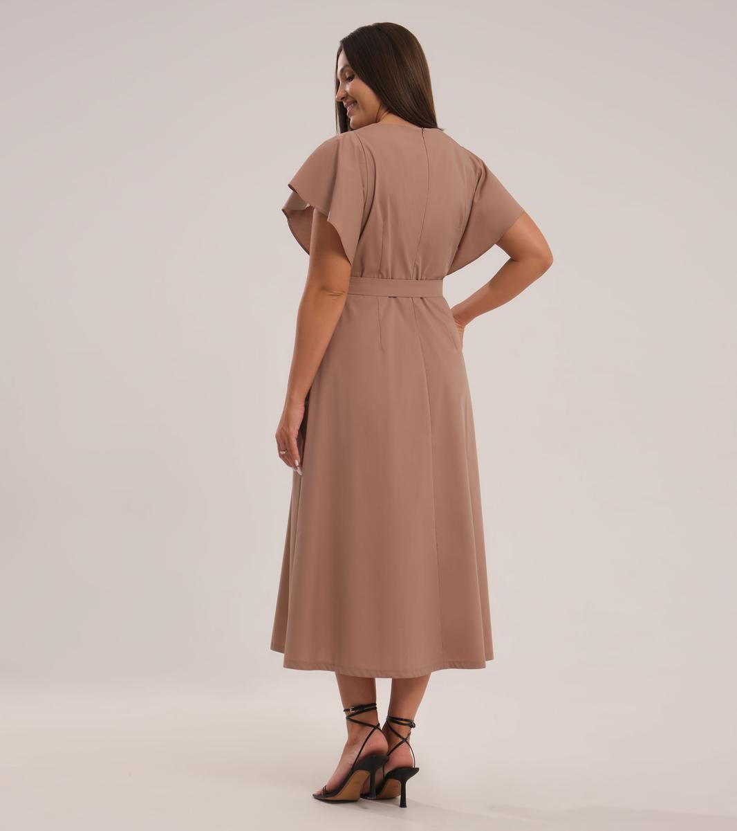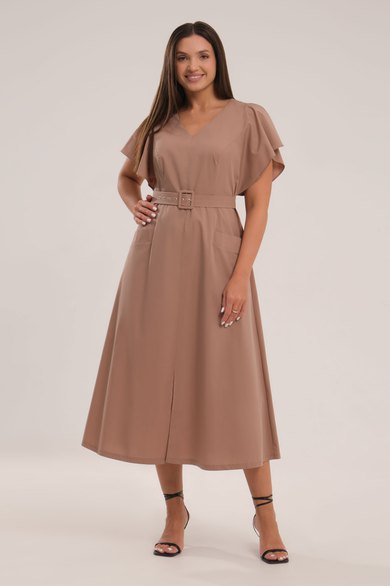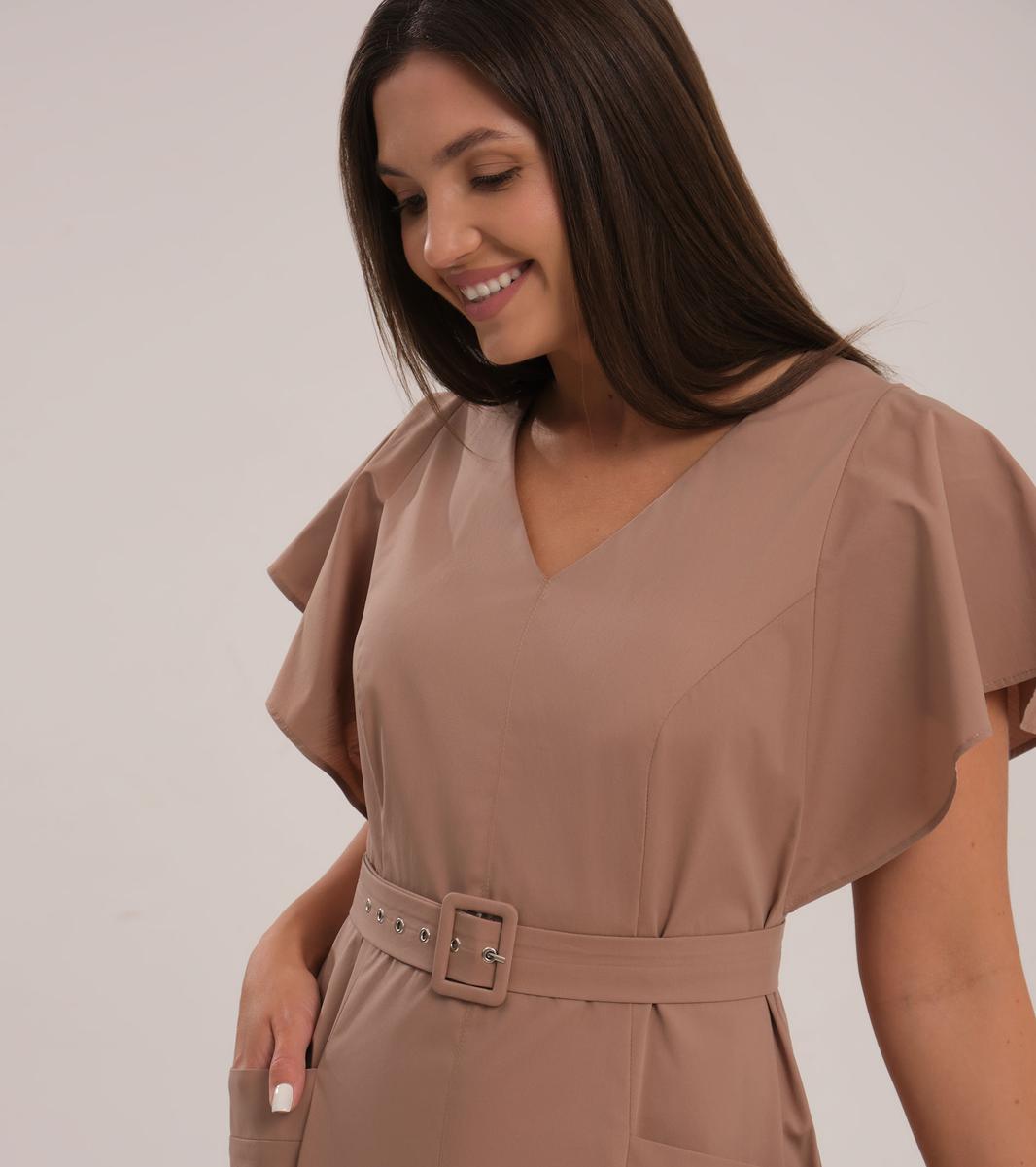 Платье приталенного силуэта с поясом, рельефами по переду и V-образной горловиной. Также на передней части платья два кармана с клапанами, средний шов, заканчивающийся встречной складкой. Спинка со средним швом, в котором находится молния, и двумя талиевыми вытачками. Рукав-объёмная рюша, входящая пройму.