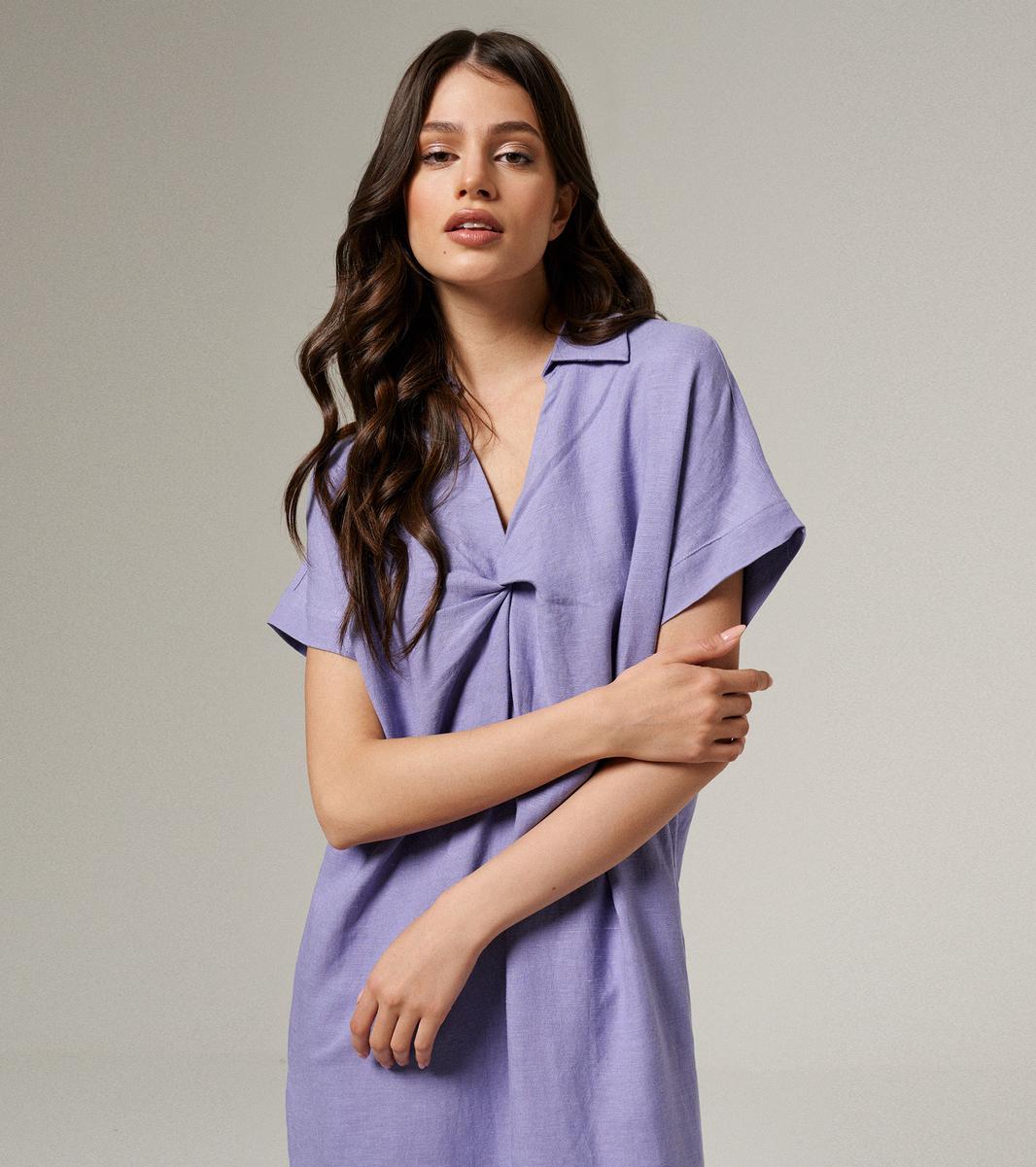 Платье женское из льняной ткани для повседневной носки. Платье прямого кроя с коротким рукавом. В боковых швах прорезные карманы, разрезы от низа изделия. На передней части изделия дизайнерский элемент.