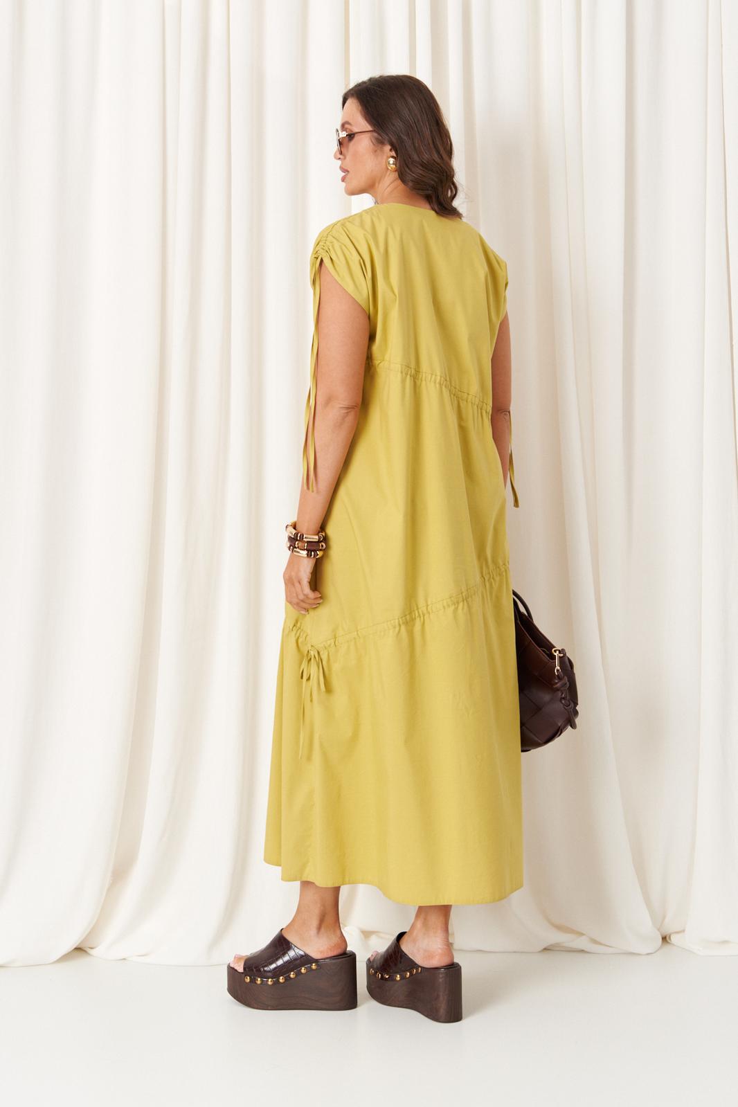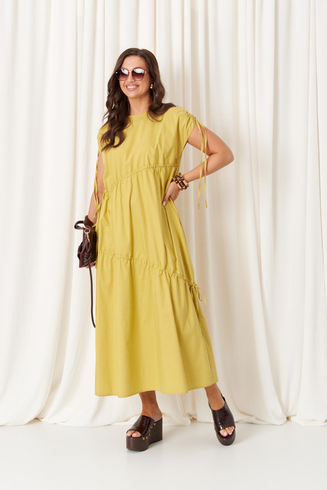 Платье женское из смесовой ткани для повседневной носки прямого силуэта. Перед и спинка имеют декоративные подрезы с вставленной кулисой, затягивающейся на шнурок. Горловина обработана обтачкой. Плечевой срез обработан декоративными подрезами с вставленной кулисой, затягивающейся на шнурок. Платье будет прекрасным вариантам на все случаи жизни, легкое и утонченное, а главное очень комфортное в носке.