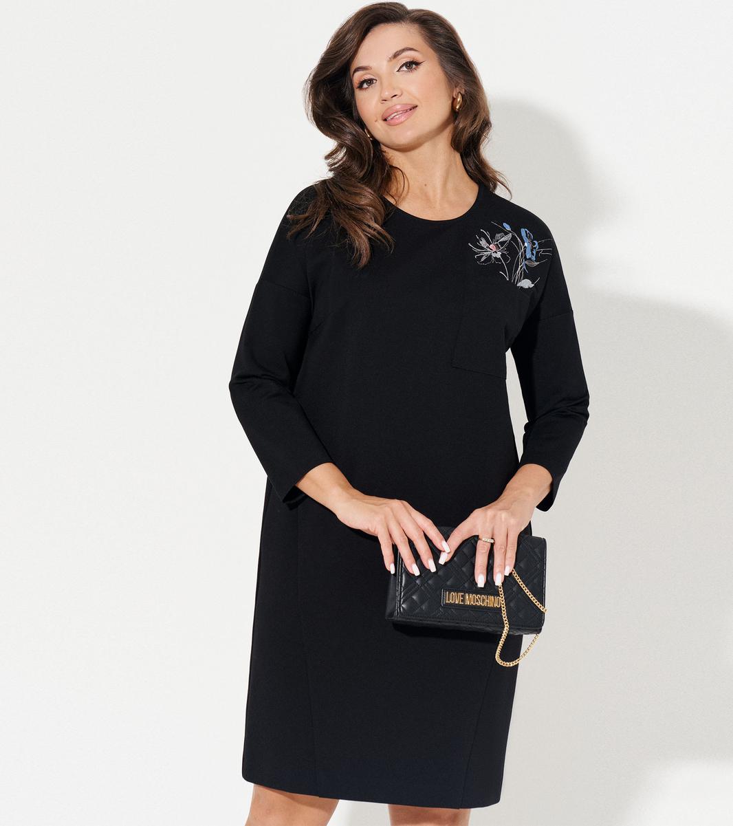 Стильное лаконичное платье из трикотажного полотна. Платье зауженное к низу, с круглым вырезом горловины по переду и фигурным вырезом горловины по спинки.По спинки имеется декоративная молния. Платье дополнено карманом по переду и изящной дизайнерской вышивкой.