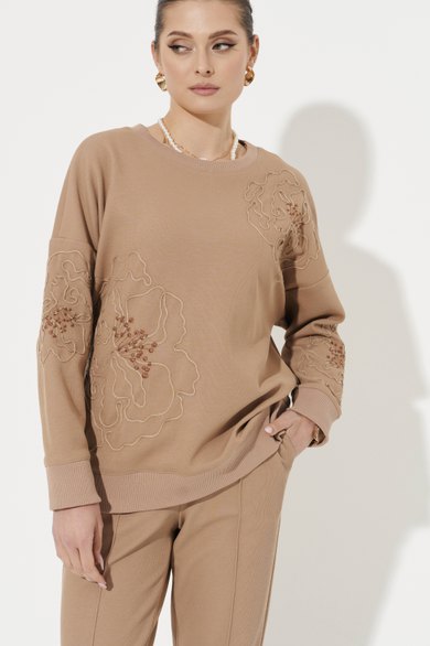 Джемпер женский из смесового трикотажного полотна с добавлением хлопка. Джемпер прямого силуэта для повседневной носки. Джемпер имеет по переду декоративную вышивку шнуром в виде цветов. По низу изделия имеется притачной слегка тянущийся пояс. Спинка прямая, без шва. Линия плеча спущена. Рукава втачные длинные, низ рукава обработан слегка тянущейся притачной манжетой. Горловина обработана притачной слегка тянущейся бейкой. Отличный вариант в прохладное время. Станет замечательным дополнением к вашему образу.