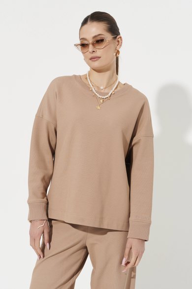 Джемпер женский из смесового трикотажного полотна с добавлением хлопка. Джемпер прямого силуэта. По переду низ изделия короче, чем по спинке с разрезами в боковом шве. Горловина обработана планкой из довяза. Низ рукава обработан манжетой на довязе, рукава длинные, а также по низу рукава имеется дизайнерская вышивка в виде надписи. Джемпер подойдет для любого рода мероприятий.