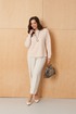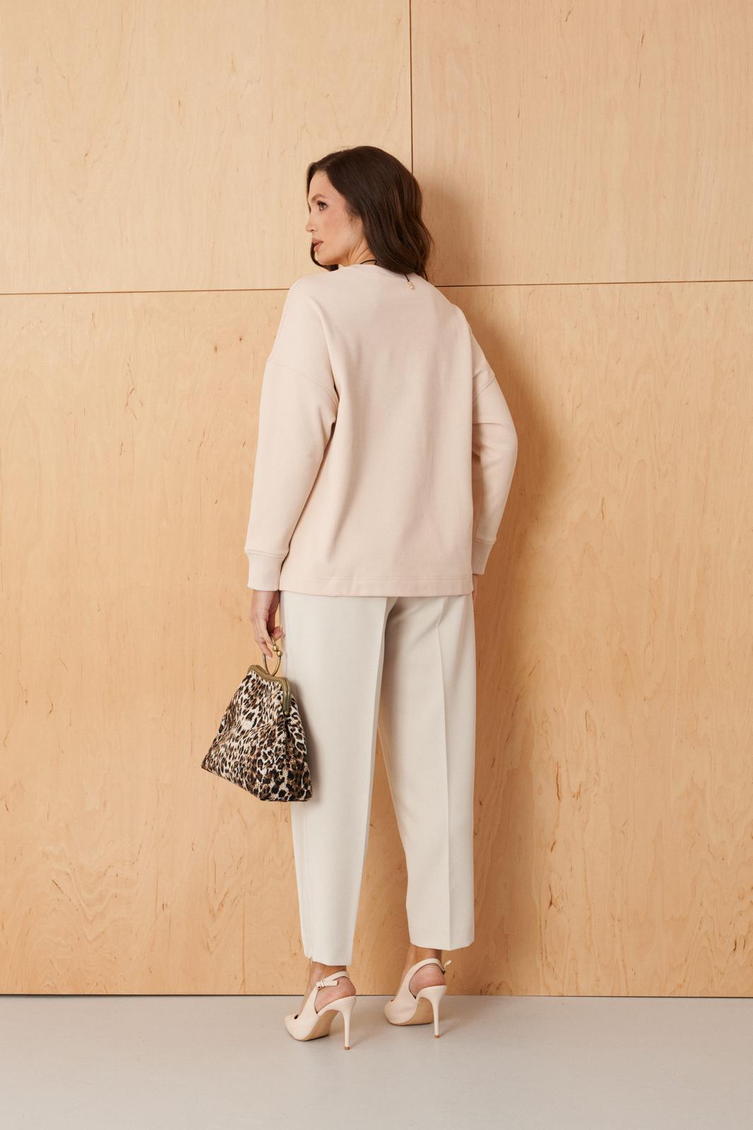 Джемпер женский из смесового трикотажного полотна с добавлением хлопка. Джемпер прямого силуэта. По переду низ изделия короче, чем по спинке с разрезами в боковом шве. Горловина обработана планкой из довяза. Низ рукава обработан манжетой на довязе, рукава длинные, а также по низу рукава имеется дизайнерская вышивка в виде надписи. Джемпер подойдет для любого рода мероприятий.