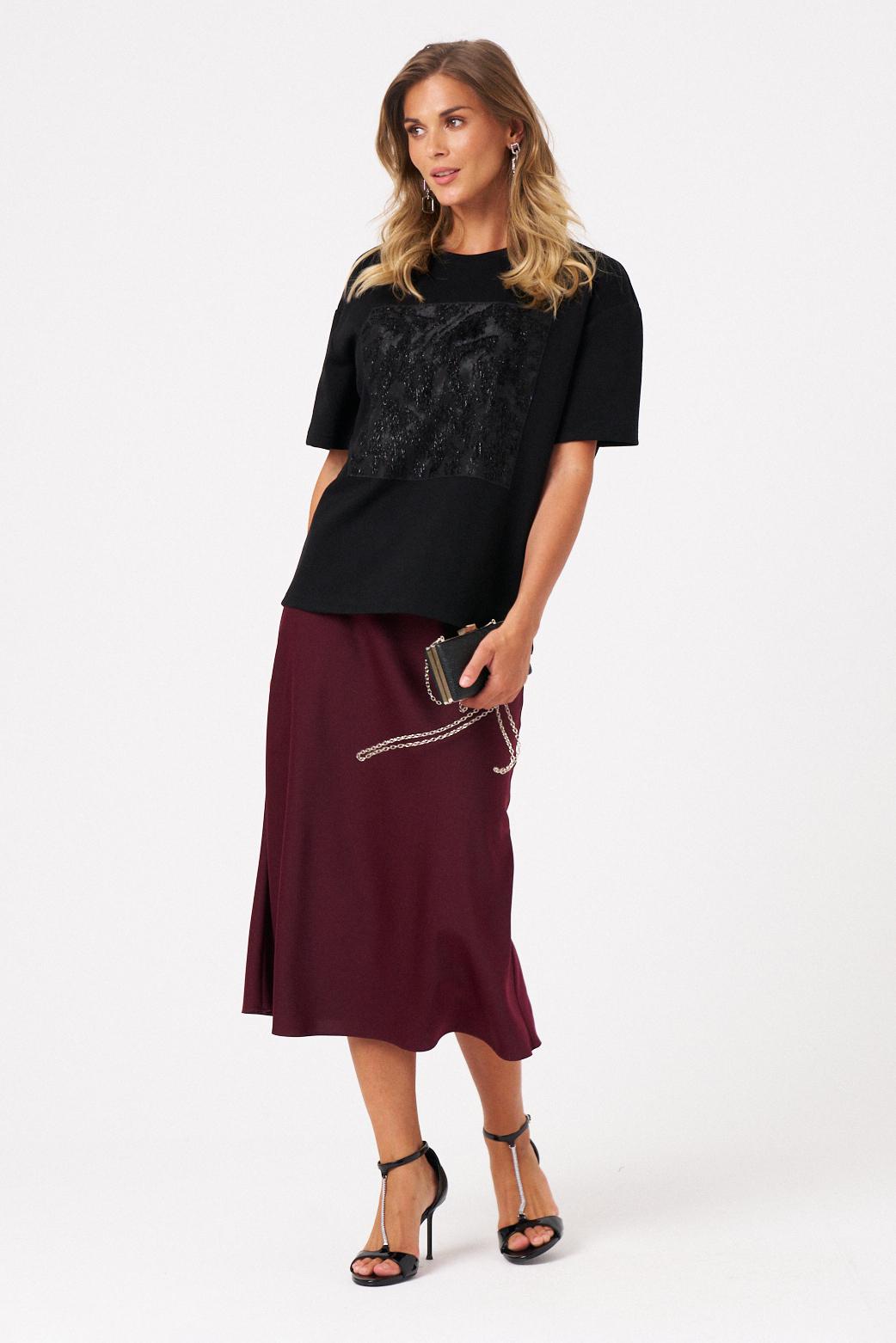 Женский джемпер из поливискозного трикотажного полотна, идеально подходящий для повседневной носки. Модель выполнена прямого силуэта, что обеспечивает свободу движений и комфорт. На передней части джемпера расположен декоративный элемент в виде квадрата, внутренняя часть которого выполнена из ткани с эффектом «травки», придавая изделию оригинальность и текстурность.