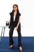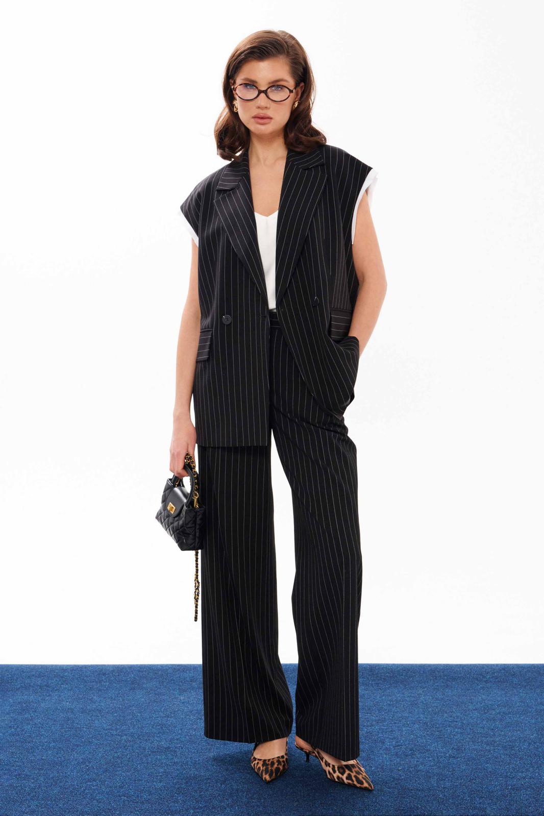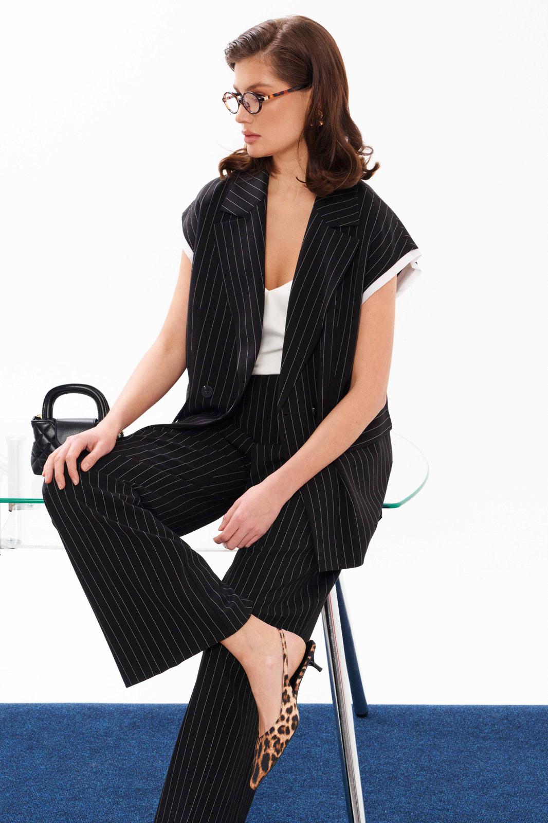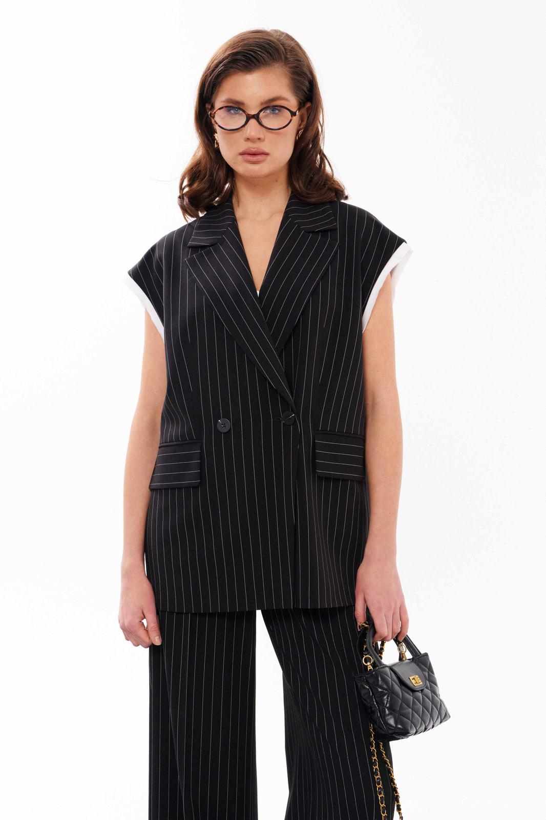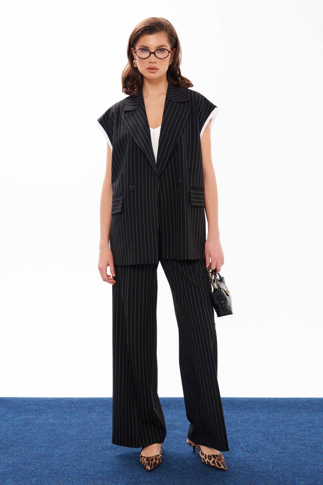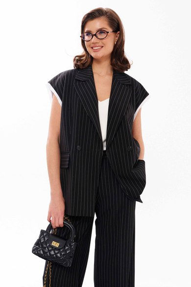 Жилет женский из смесовой ткани для повседневной носки. Жилет прямого силуэта. Жилет двубортный на одну обметанную петлю и одну пуговицу. Перед имеет две талиевые вытачки и два кармана с клапаном и двумя обтачками. Спинка разрезная с регулирующимся хлястиком. Горловина обработана пиджачным воротником. Жилет без рукавов, по пройме имеется вставка из другого материала. Жилет на поливискозной подкладке. Очень стильный жакет, в котором вы обязательно очаруете всех своим внешним видом. А главное в данном жилете вы всегда будете в центре внимания.