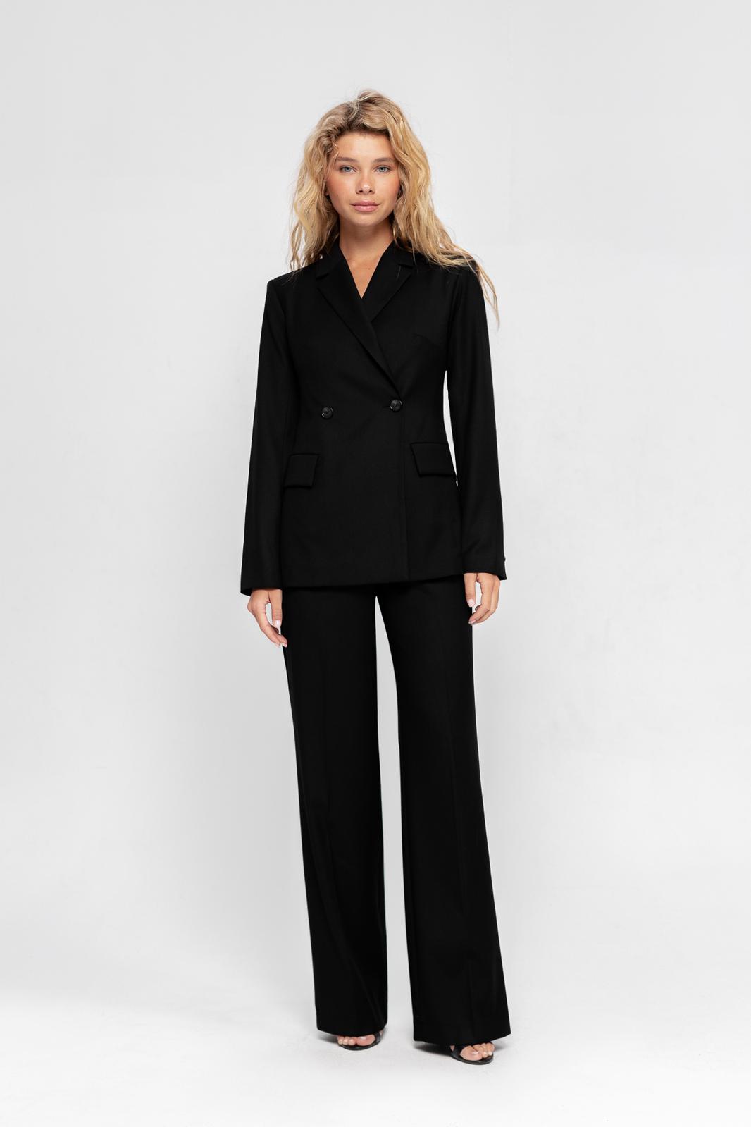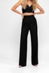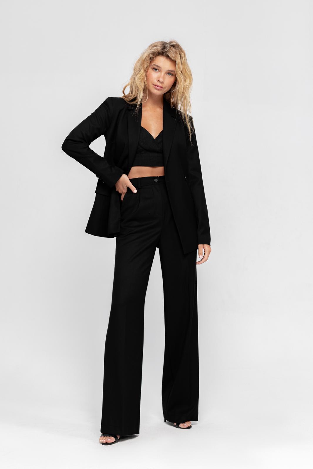 Текстильные брюки-палаццо с высокой посадкой. Детали: высокая посадка, широкие и длинные брюки, притачной пояс со шлевками, передние половины с небольшими застроченными мягкими складками и заутюженными стрелками, застежка на молнию и пуговицу, боковые карманы