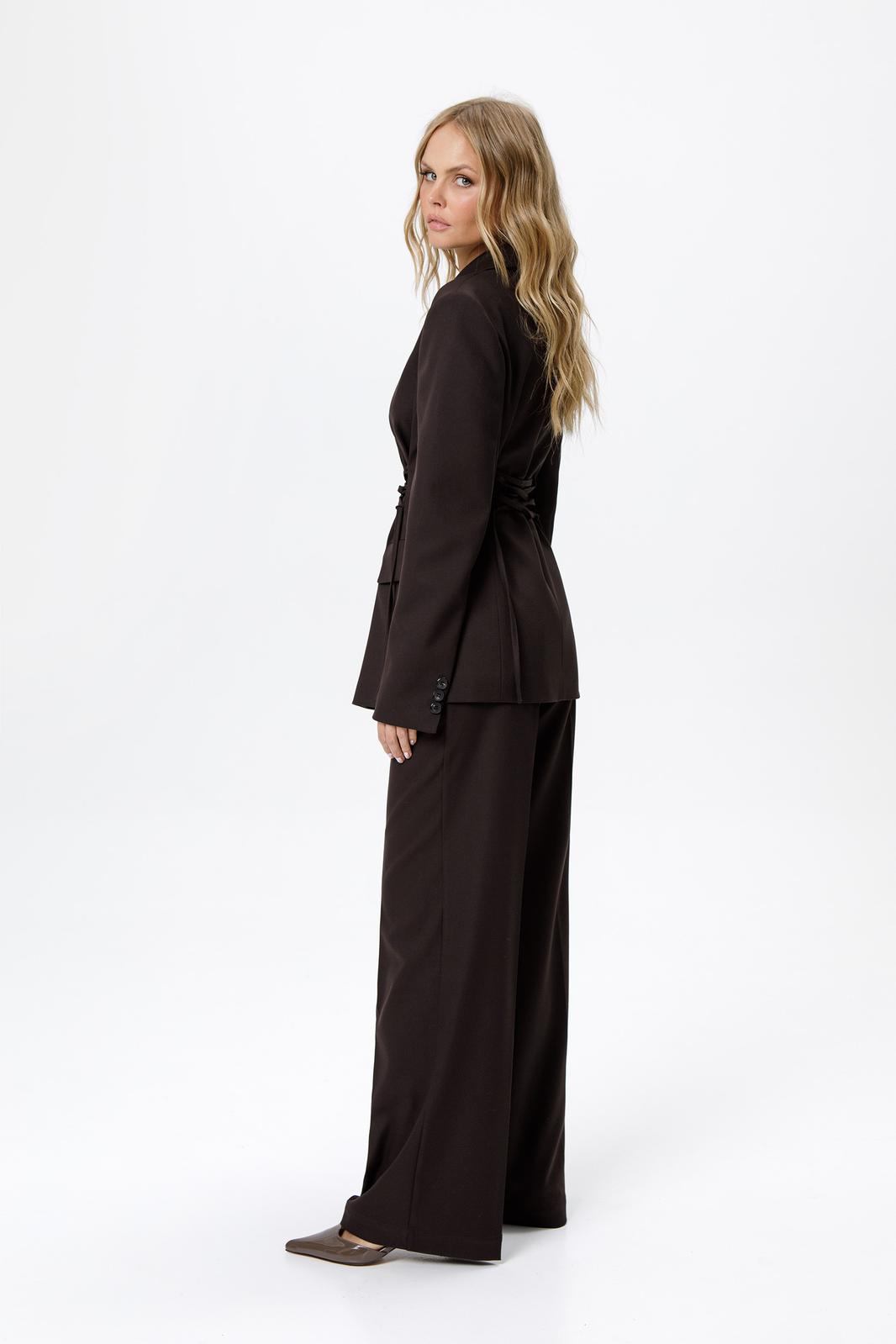 Детали: брюки с притачным поясом со шлевками, передние половины с небольшими застроченными мягкими складками и заутюженными стрелками, застежка на молнию и пуговицу, боковые карманы. Задние части брюк с вытачками и заутюженными стрелками. Пояс брюк прямой, без резинки.