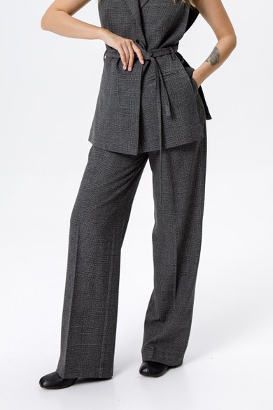 Детали: брюки с притачным поясом со шлевками, передние половины с небольшими застроченными мягкими складками и заутюженными стрелками, застежка на молнию и пуговицу, боковые карманы. Задние части брюк с вытачками и заутюженными стрелками. Пояс брюк прямой, без резинки.