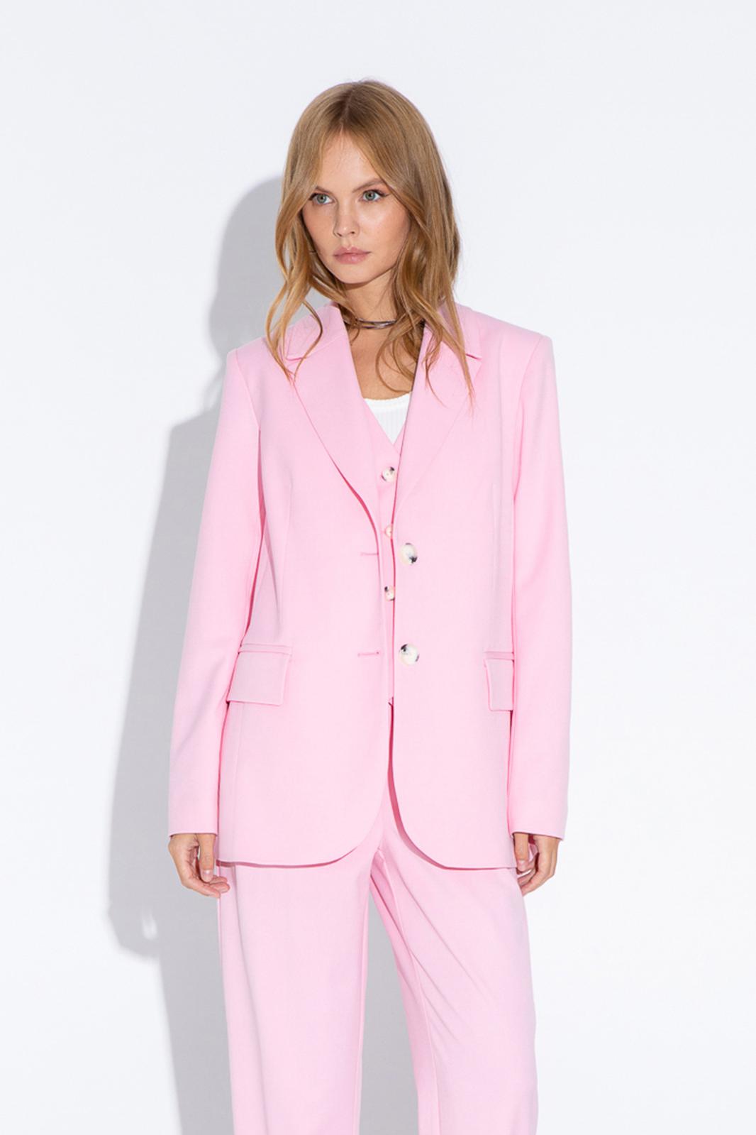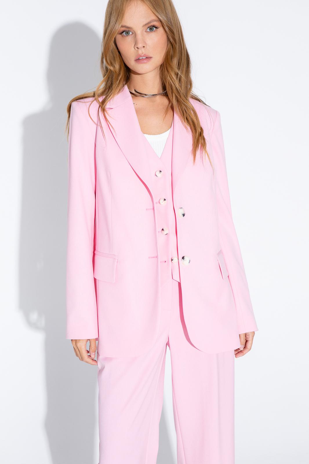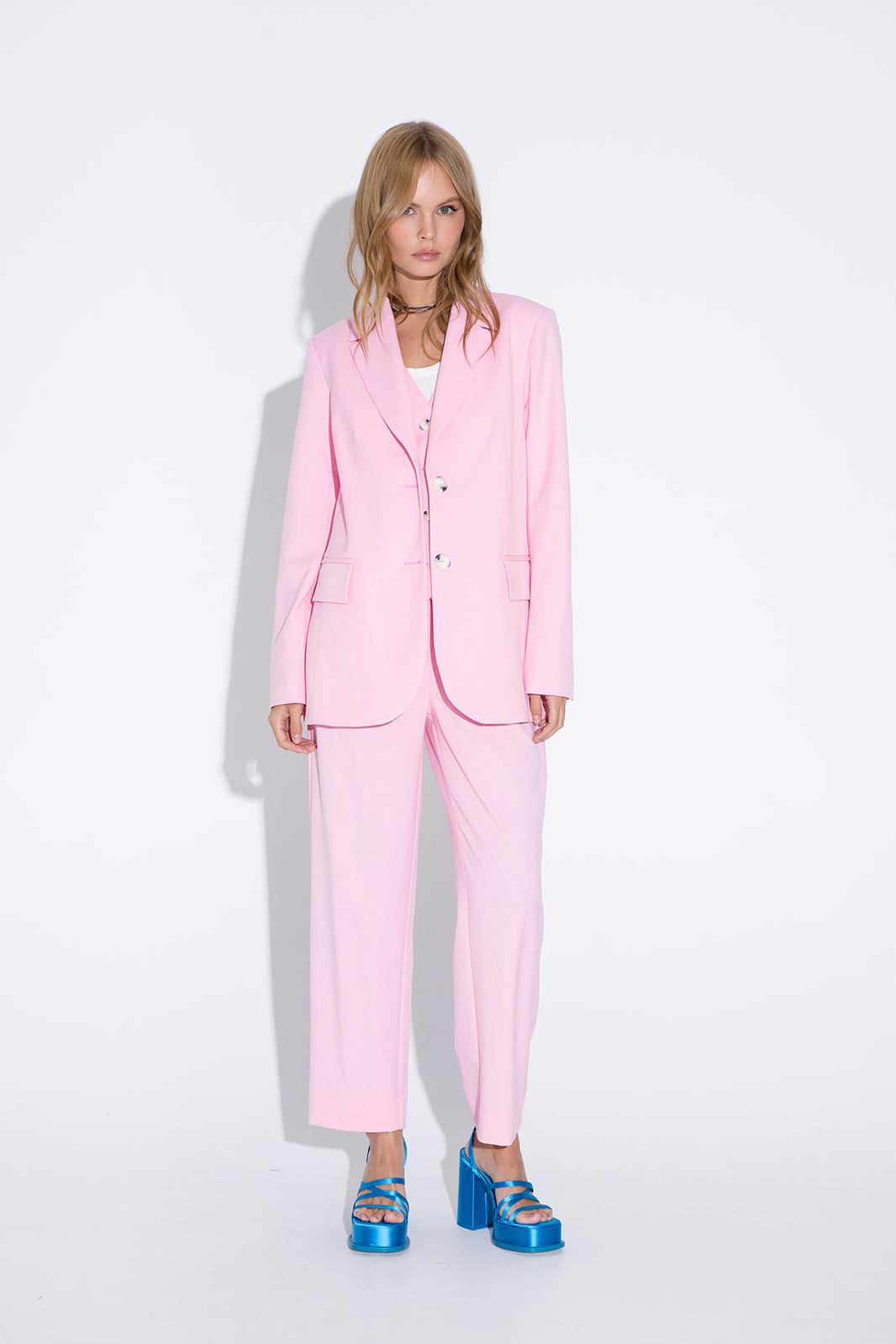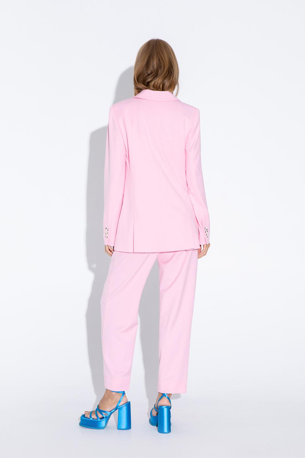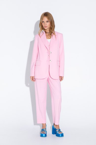 Текстильный костюм-двойка из свободного жакета со шлицами и брюк со складками Детали: жакет полуприлегающего силуэта, талиевые вытачки, пиджачный воротник, застежка на две петли и пуговицы, функциональные карманы, рукава и спинка со шлицами, жакет на подкладке из 100% вискозы. Брюки с высокой посадкой, притачной пояс со шлевками, задняя часть пояса эластичная- с резинкой, застежка на молнию и пуговицу, боковые карманы, передние половины с двумя складками