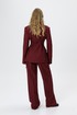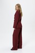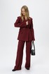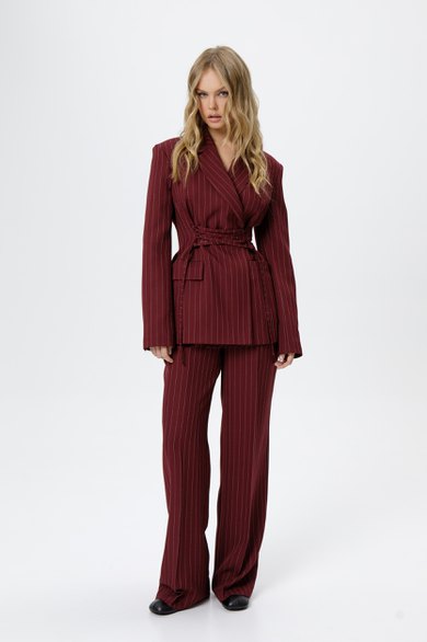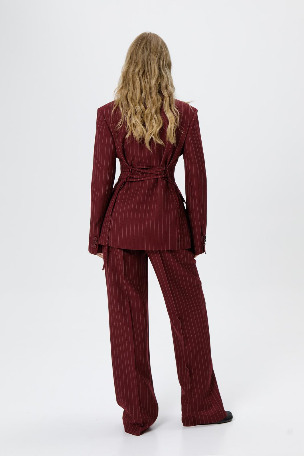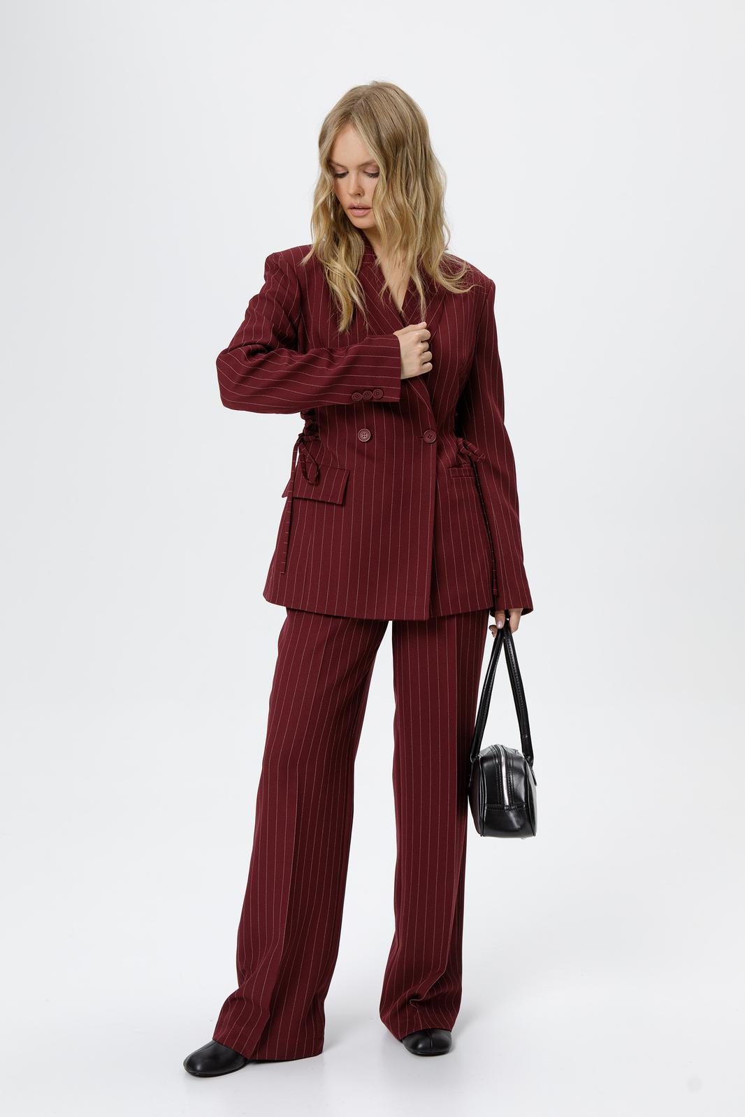 Костюм-двойка из жакета со шнуровкой с расширенной линией плеч и широких прямых брюк со стрелками из текстильной ткани в полоску. Детали: жакет полуприлегающего силуэта, рельефы, пиджачный воротник, застежка на две петли и пуговицы, функциональные карманы, жакет на подкладке. Жакет также можно зашнуровать по бокам. Брюки с притачным поясом со шлевками, передние половины с небольшими застроченными мягкими складками и заутюженными стрелками, застежка на молнию и пуговицу, боковые карманы. Задние части брюк с вытачками и заутюженными стрелками. Пояс брюк прямой, без резинки.