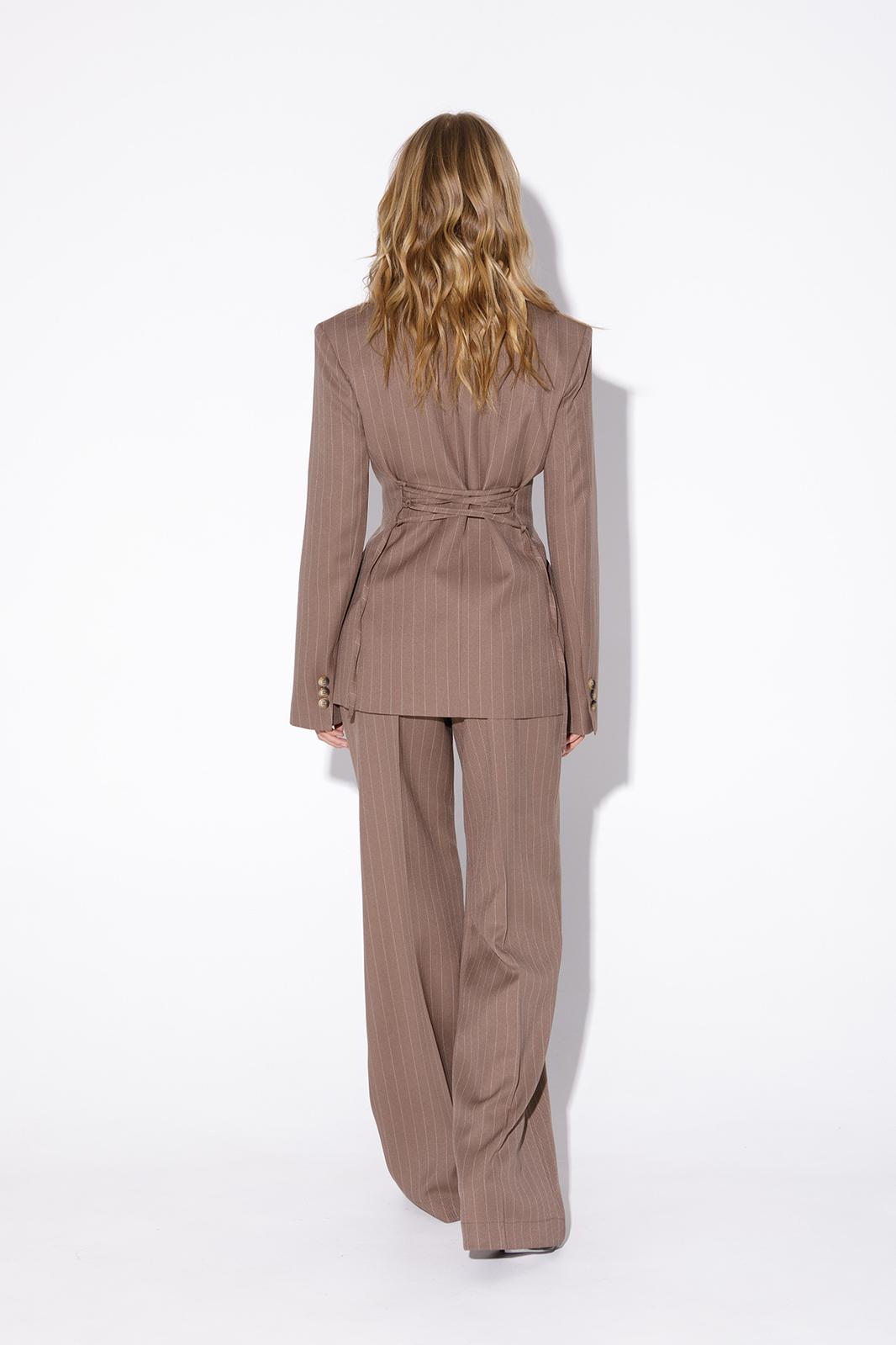 Жакет со шнуровкой из текстильной ткани в полоску. Детали: жакет полуприлегающего силуэта, расширенные плечи, рельефы, пиджачный воротник, застежка на две петли и пуговицы, функциональные карманы, жакет на подкладке. Жакет также можно зашнуровать по бокам.