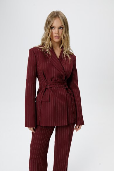 Жакет со шнуровкой из текстильной ткани в полоску. Детали: жакет полуприлегающего силуэта, расширенные плечи, рельефы, пиджачный воротник, застежка на две петли и пуговицы, функциональные карманы, жакет на подкладке. Жакет также можно зашнуровать по бокам.