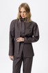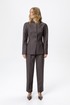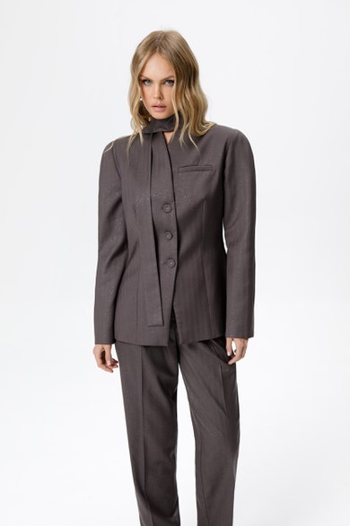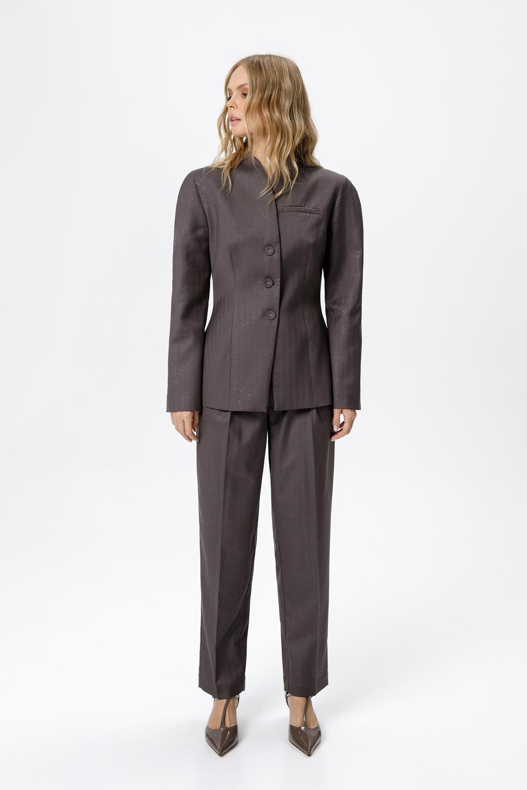Костюм-двойка из приталенного жакета с акцентными плечами и укороченных классических брюк со стрелками.