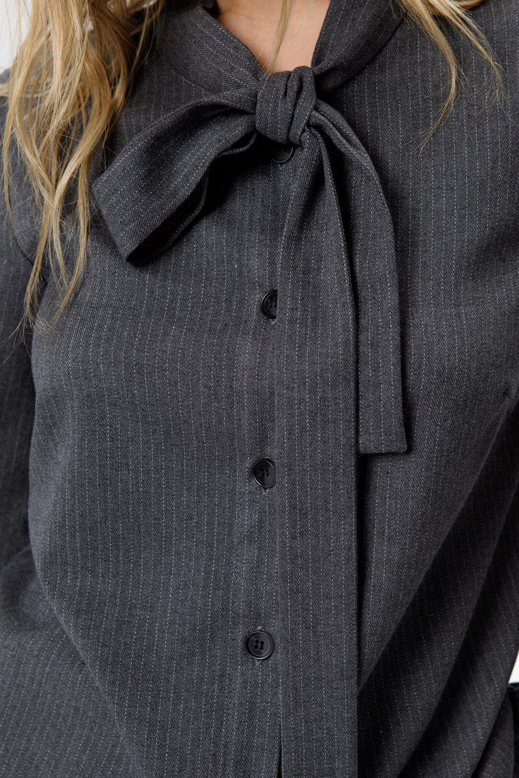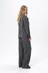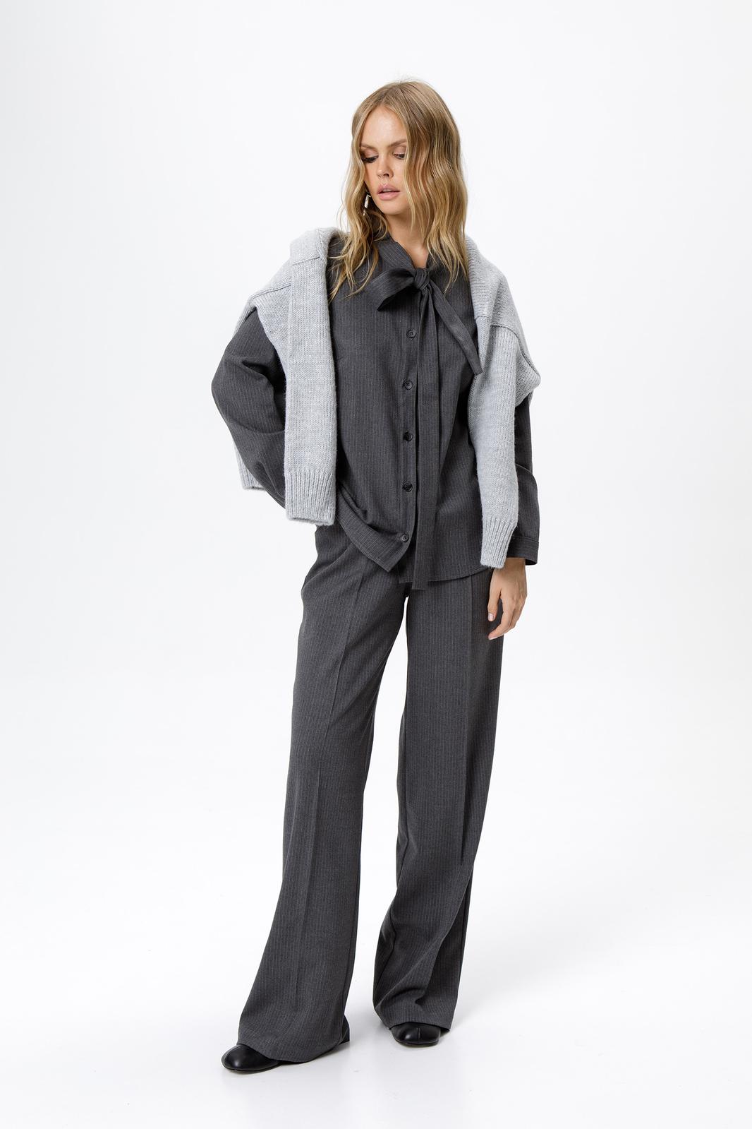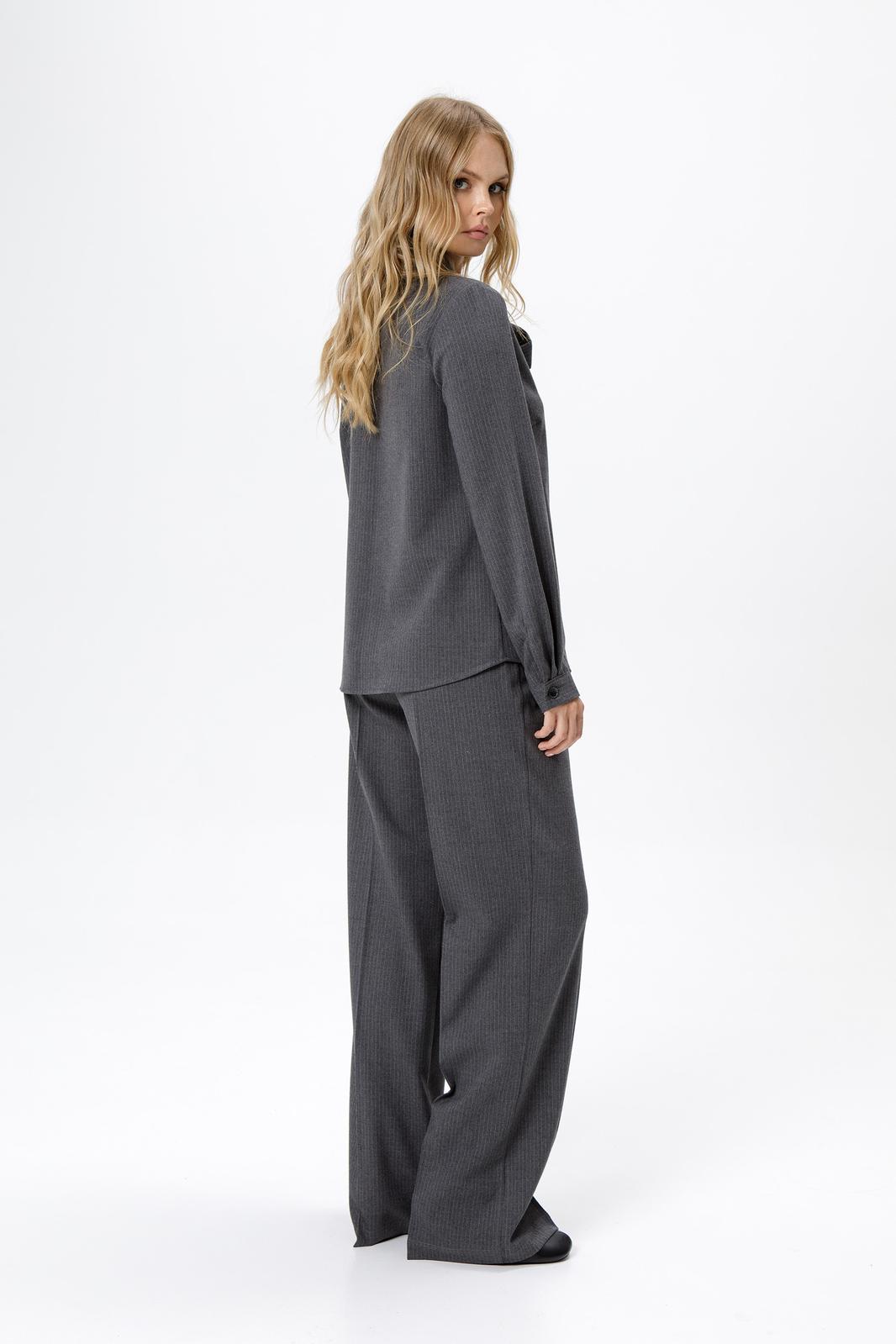 Детали: рубашка прямого силуэта, застежка на петли и пуговицы, длинные рукава с притачными манжетами. Брюки с высокой посадкой, притачной пояс со шлевками, передние половины с небольшими застроченными мягкими складками и заутюженными стрелками, застежка на молнию и пуговицу, боковые карманы.