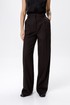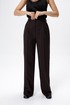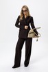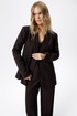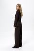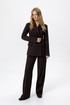Детали: приталенный силуэт, пиджачный воротник, функциональные карманы, двубортная застежка на петли и пуговицы, спинка со средним швом, втачные двухшовные рукава, жакет на подкладке. Брюки с высокой посадкой на притачном поясе со шлевками, передние половины с небольшими застроченными мягкими складками и заутюженными стрелками, застежка на молнию и пуговицу, боковые карманы.