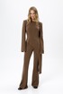 Трикотажный костюм-двойка из асимметричной туники и облегающих брюк-клеш.