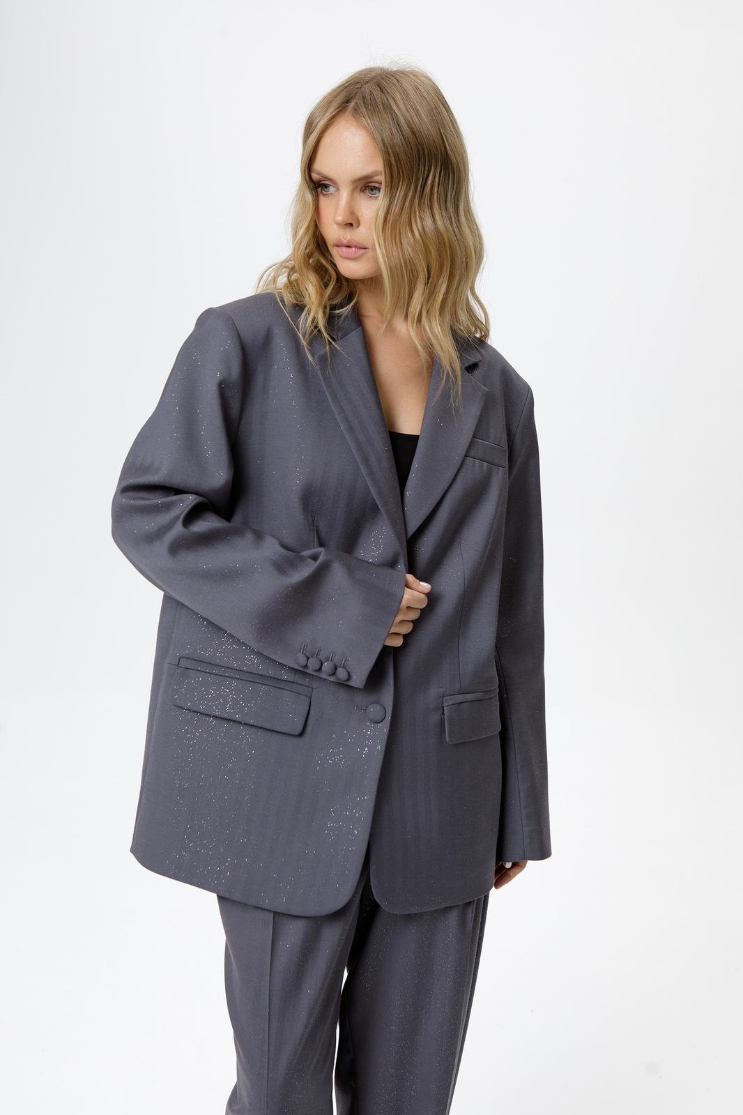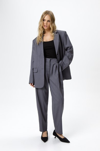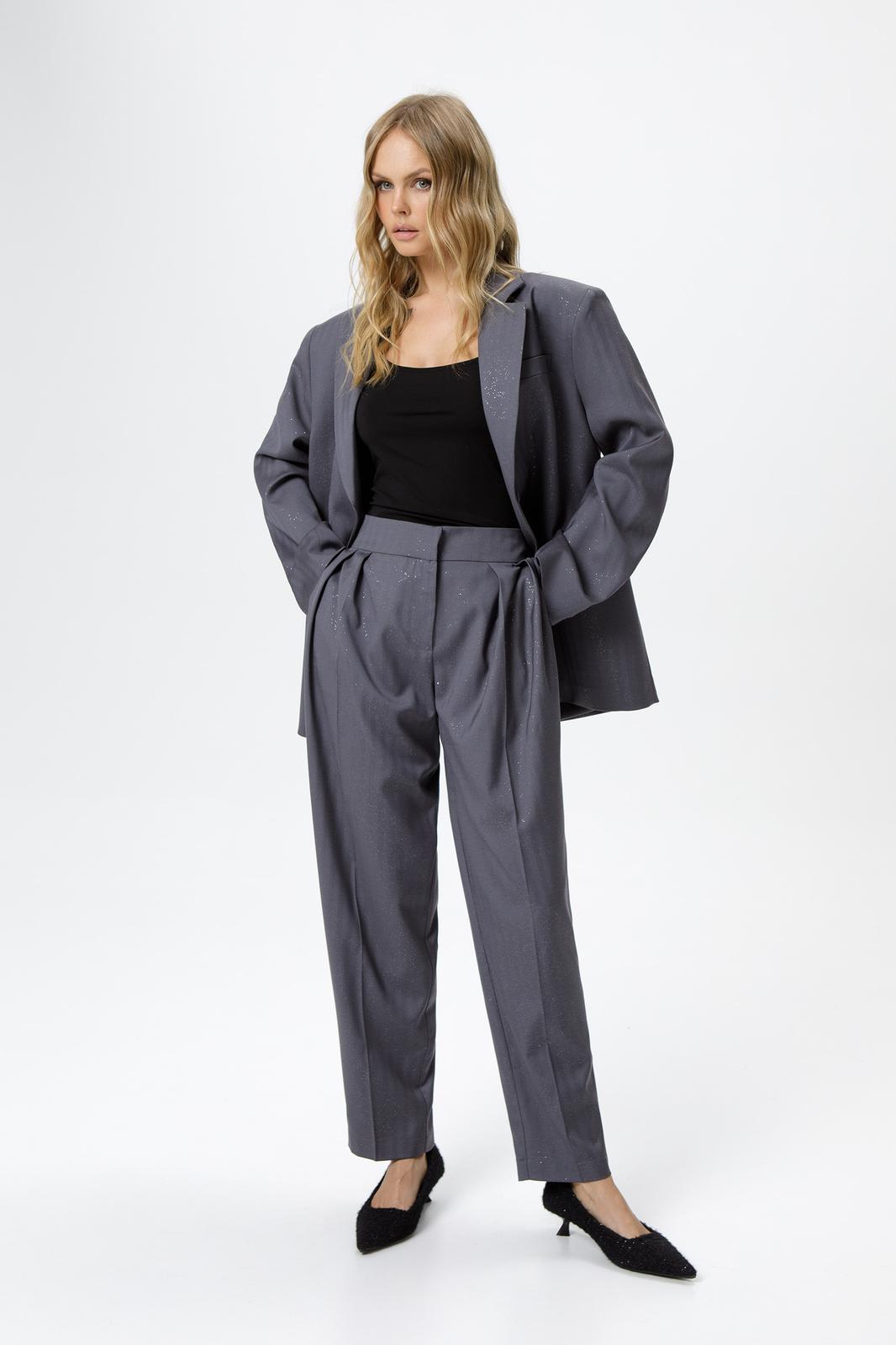 Костюм-двойка из оверсайз жакета и брюк со складками из костюмной ткани с блестками.