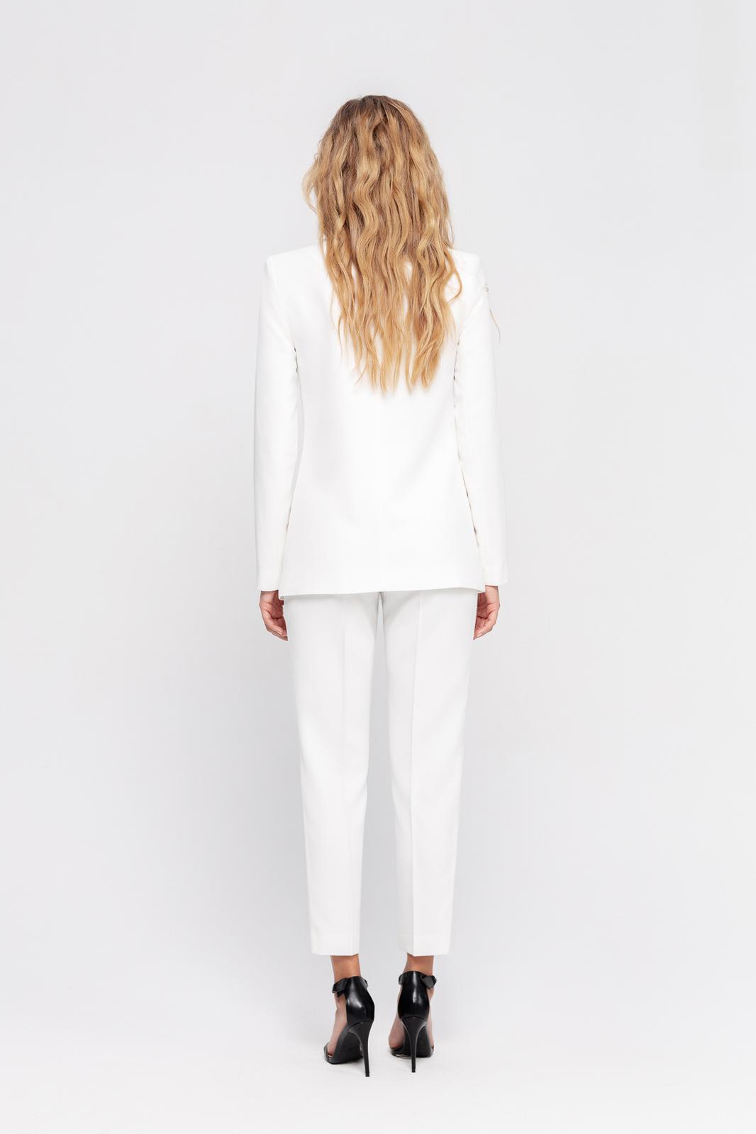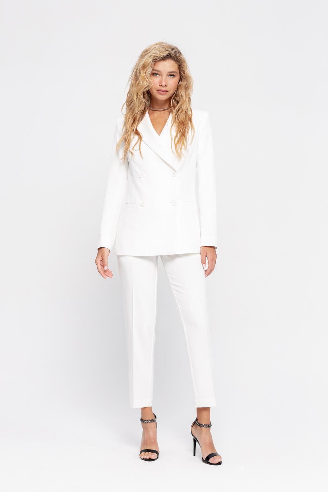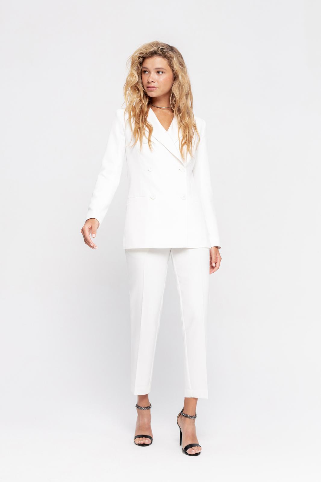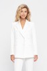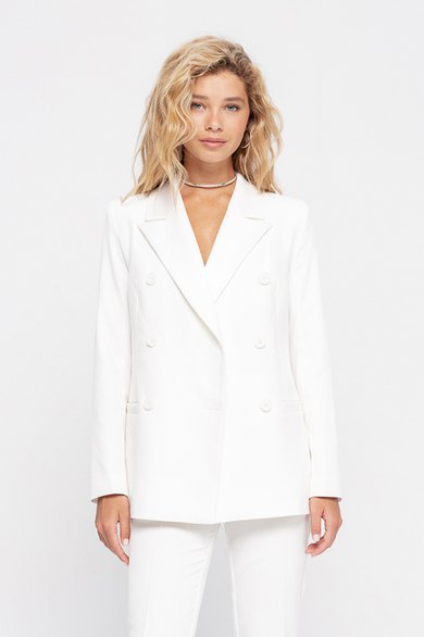 Текстильный классический жакет прямого кроя. Детали: жакет полуприлегающего силуэта, пиджачный воротник, перед с прорезными карманами, двубортная застежка на петли и пуговицы, спинка со средним швом, рукава втачные двухшовные, жакет на подкладке