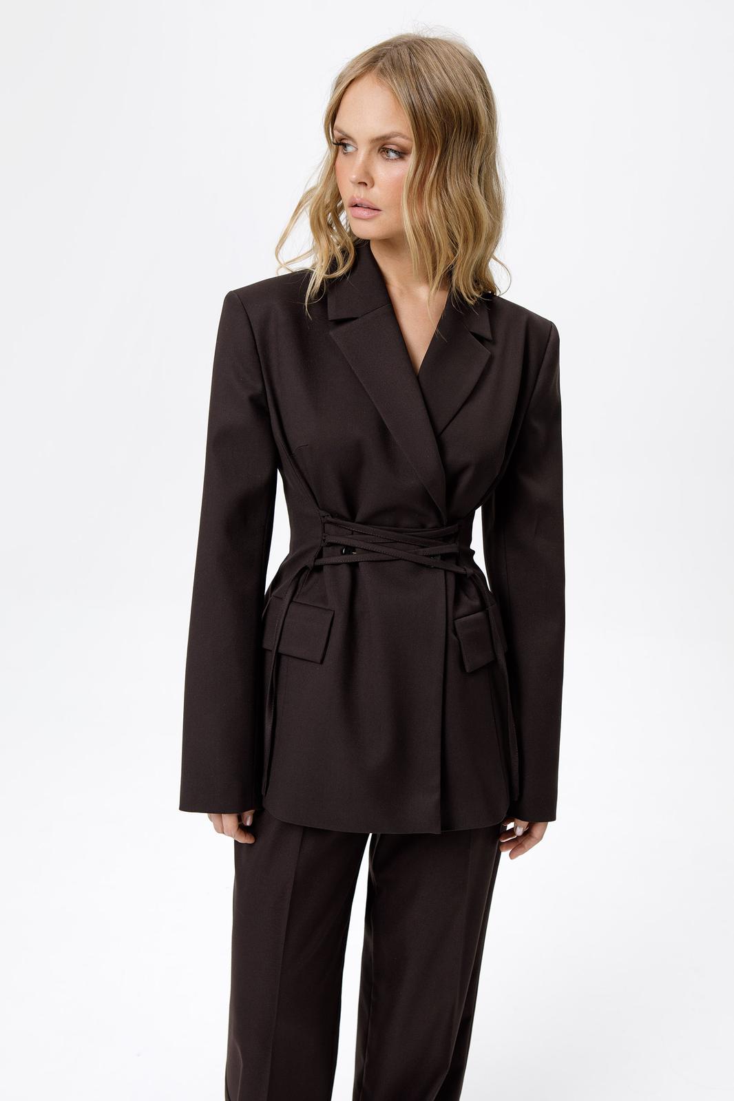 Детали: жакет полуприлегающего силуэта, расширенные плечи, рельефы, пиджачный воротник, застежка на две петли и пуговицы, функциональные карманы, жакет на подкладке. Жакет также можно зашнуровать по бокам.