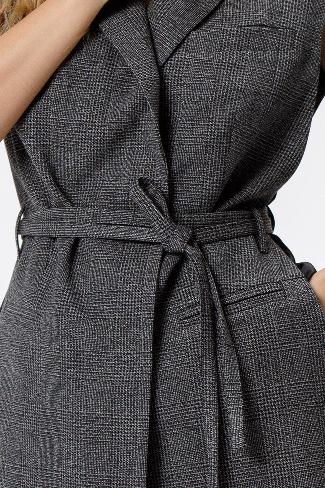 Детали: жилет прямого силуэта, талиевые вытачки переда и спинки, пиджачный воротник, застежка на пришивные кнопки, спинка со средним швом и шлицей, функциональные карманы, жилет на подкладке, в комплекте пояс из основной ткани и чёрный пояс-шнурок из кожзама.