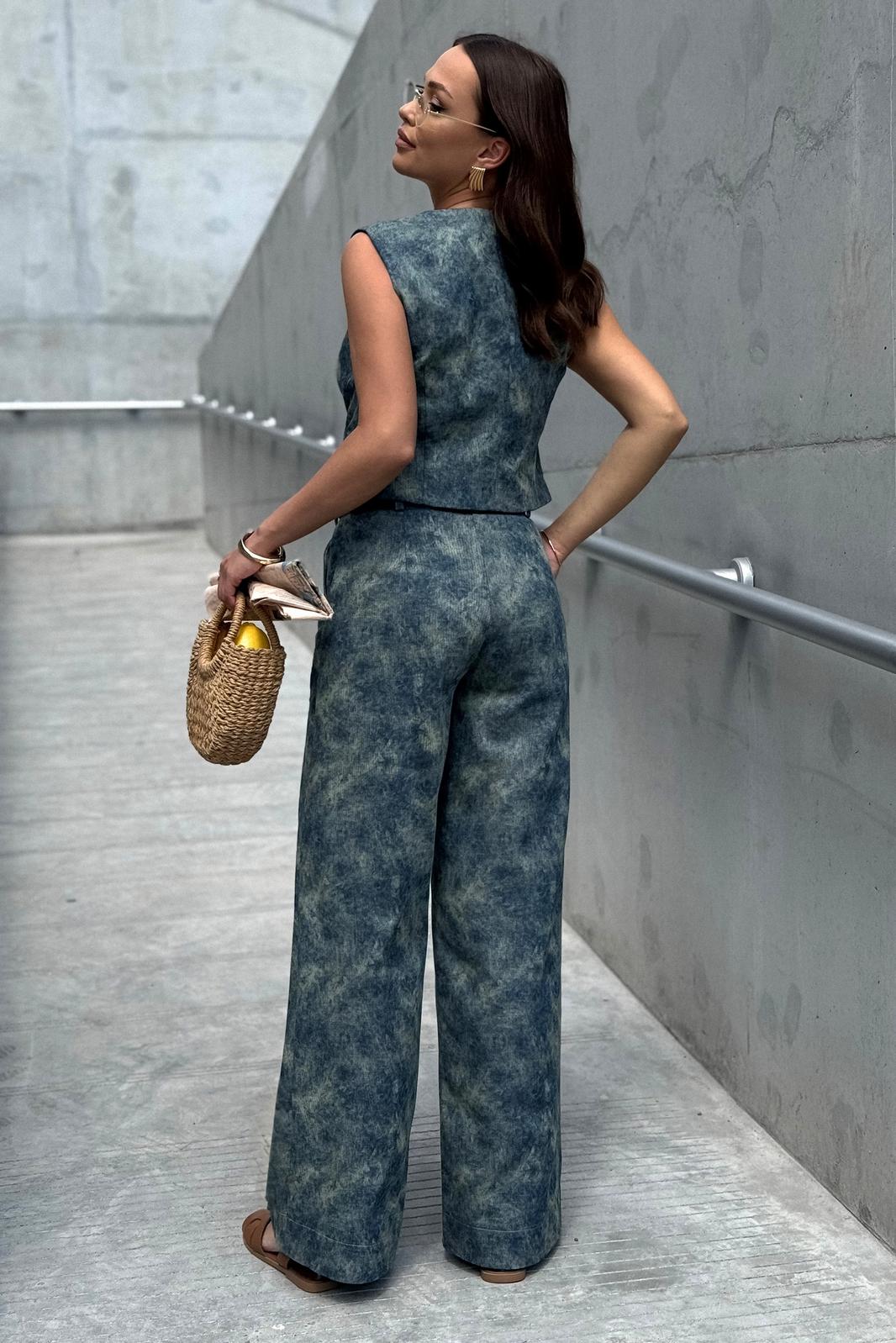 Брюки женские прямые из текстильной ткани (джинс). В боковых швах расположены подрезные карманы. По задним половинкам расположены талиевые вытачки. Верх брюк обработан притачным поясом со шлевками.