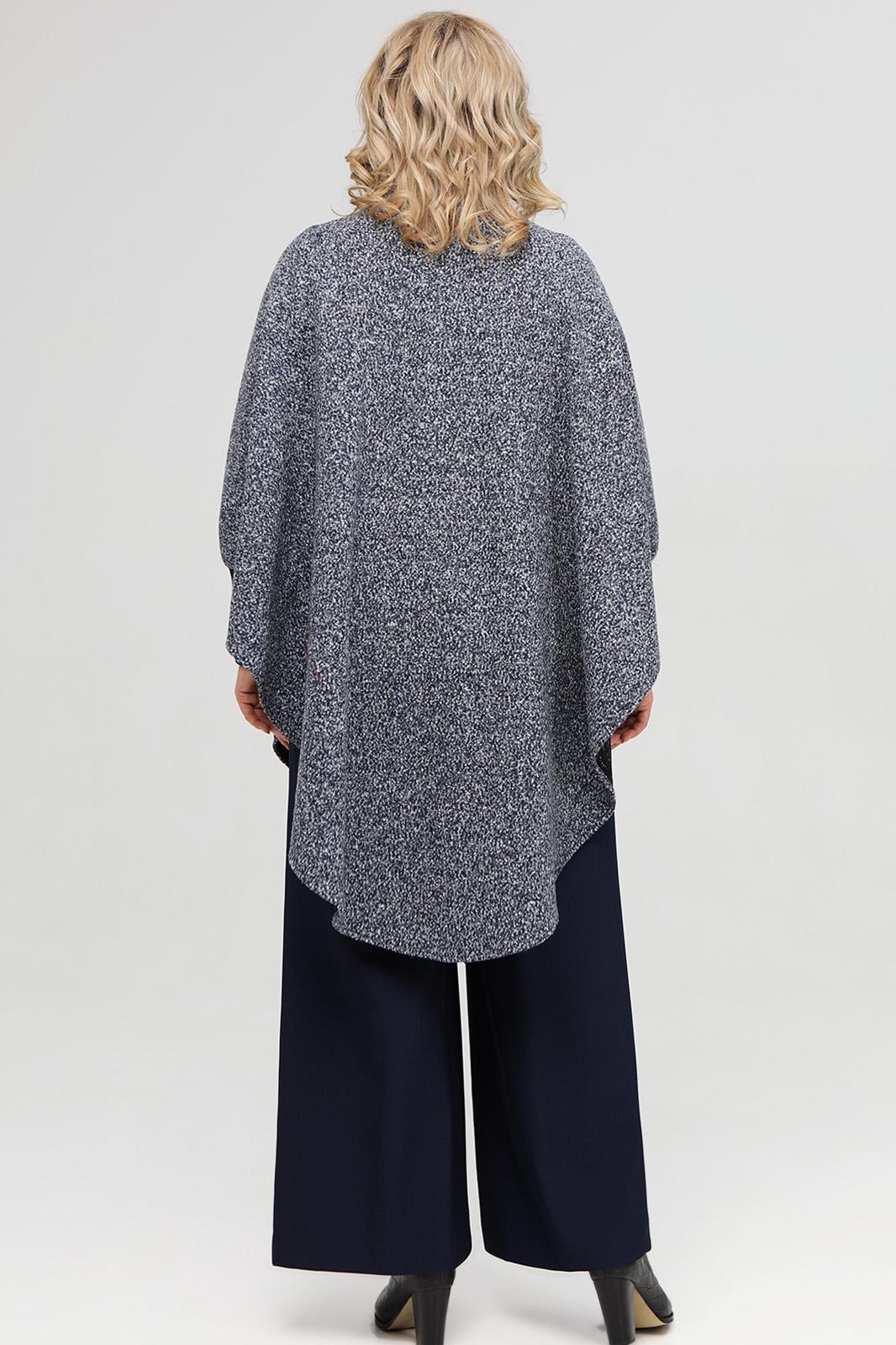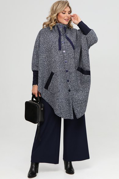 Женское пончо, выполненное из плотного трикотажа с лицевой поверхностью «букле». Застежка центральная бортовая на петли и пуговицы. Воротник – высокая стойка, по линии отлета которого есть кулиса. В кулису продета лента, концы которой выходят через крупные люверсы. Пончо округлой формы по низу и открытое с низу. Есть высокие облегающие манжеты, выполненные из плотного гладкого трикотажа. По переду также есть накладные карманы округлой формы с листочками, которые также выполнены из однотонного трикотажа. Линия входа в карман наклонная. Длина изделия по спинке от шва втачивания воротника в горловину 102 см. Длина рукава 62 см.