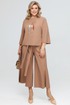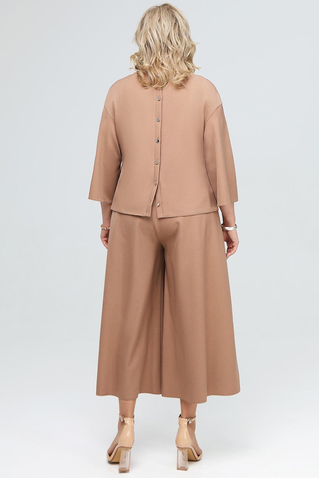 Женский комплект двойка, состоящий из блузы и кюлот. Кюлоты без боковых швов, а фиксация изделия происходит на линии талии с заходом деталей задних частей брюк на детали переда. Кюлоты имеют расширенный к низу с силуэт. Длина по боковому шву от верха 95 см.