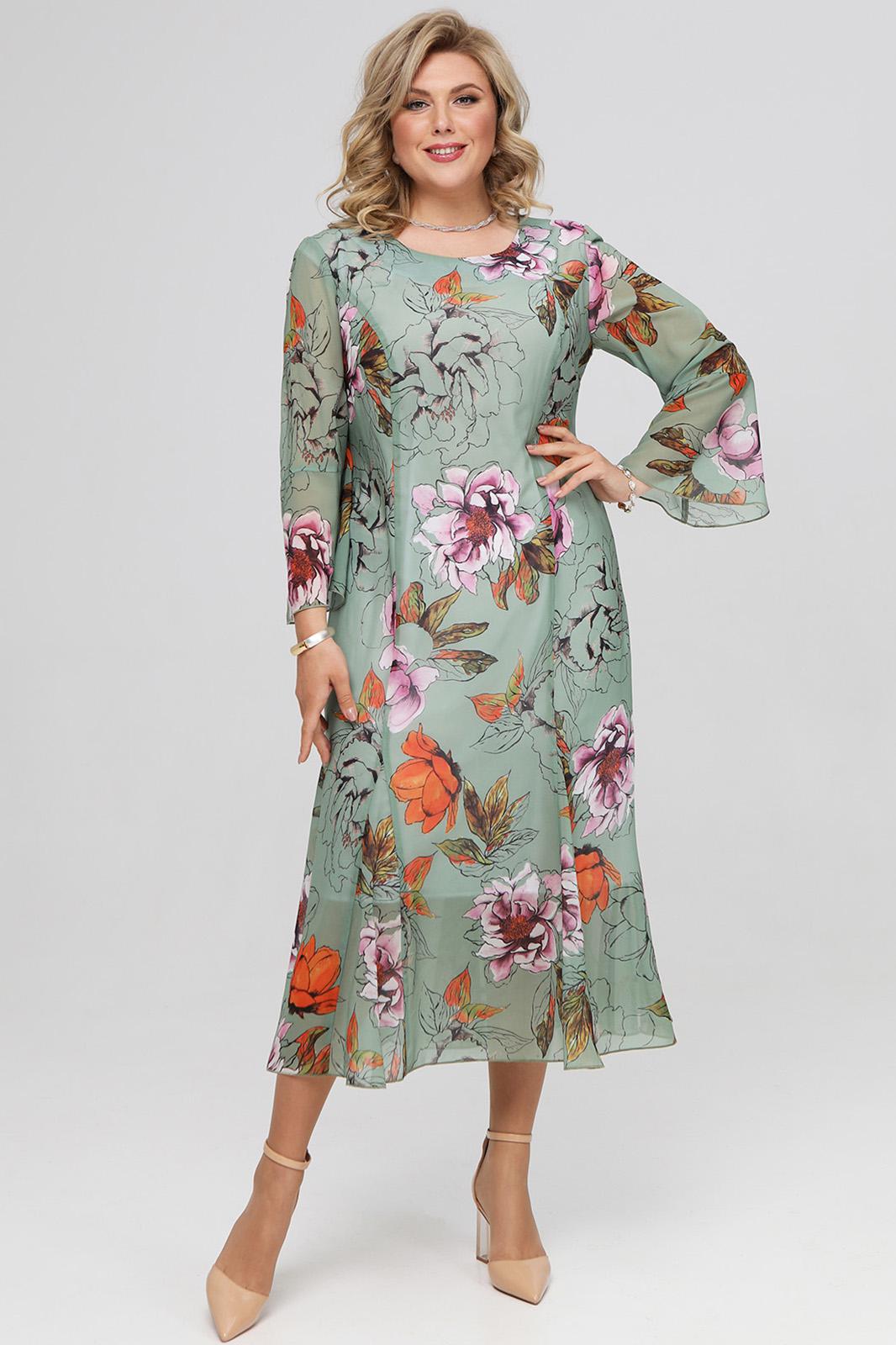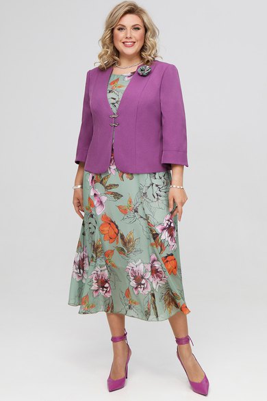 Комплект из жакета и платья. Платье из шифона на трикотажной подкладке. Рельефы переда и спинки из пройм до низа. Спинка со средним швом. Внизу во все швы вставлены клинья из шифона. Рукав – 53 см. с подрезом. В боковом шве молния. Жакет с центральной застежкой на декоративной фурнитуре. Рельефы спереди из пройм до низа. Спинка со средним швом и рельефами. Рукава 49 см., двухшовные с закруглениями по низу локтевого шва. Горловина переда фигурная. Жакет с плечевыми. Полочки на подкладке. Длина платья – 129 см., жакета – 60 см.