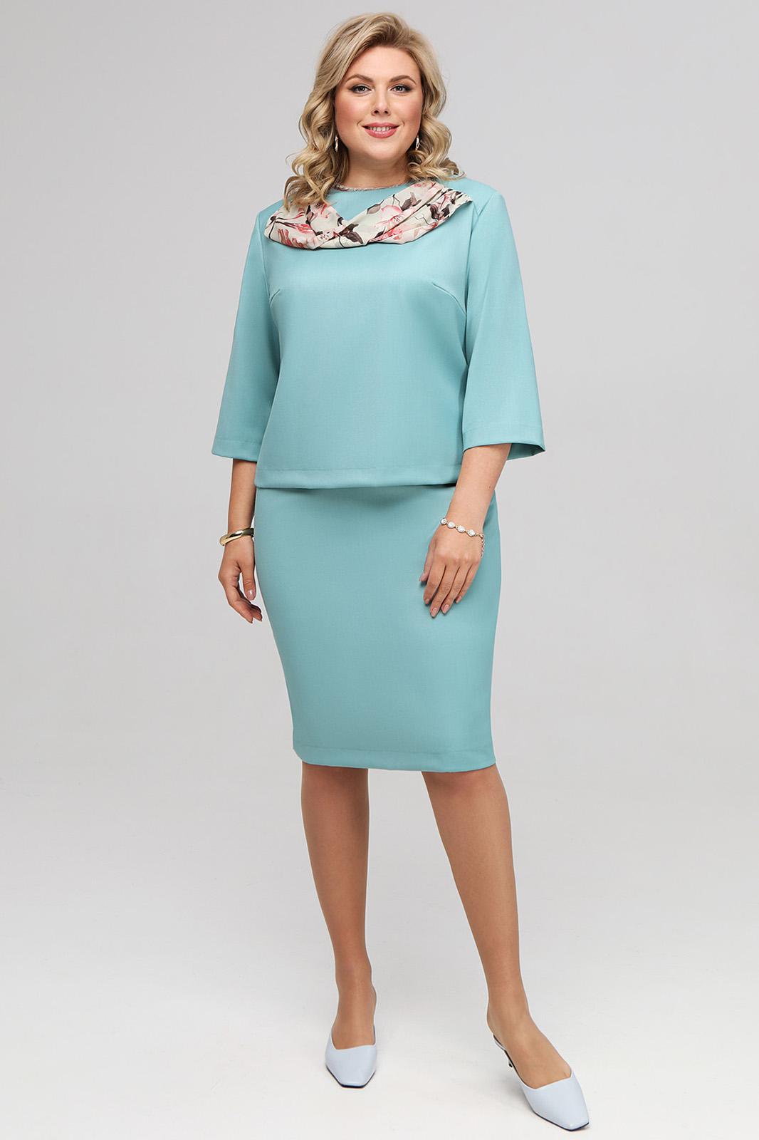 Комплект женский двухпредметный, состоящий из блузы и юбки «карандаш». Комплект выполнен из ткани костюмно-плательного ассортимента. Блуза полуприлегающего скользящего силуэта. Рукав втачной. Вырез горловины лодочка. По переду есть высокие кокетки в швы которых крепиться мягкий драпирующийся шарф из шифона с дизайном. Спинка имеет фигурный подрез, выходящий из горловины, с неглубоким разрезом с закругленными краями. Разрез фиксируются широкими завязками из шифона с дизайном, которые также служат декором. Длина изделия по спинке 62 см. Длина рукава 43 см. Юбка на притачном поясе, в который на участке спинки вставлена эластичная тесьма. На задней части юбки есть средний шов, в котором располагается застежка на потайную тесьма молнию, а по низу шва – шлица. Длина юбки по боковому шву от верха 69 см.