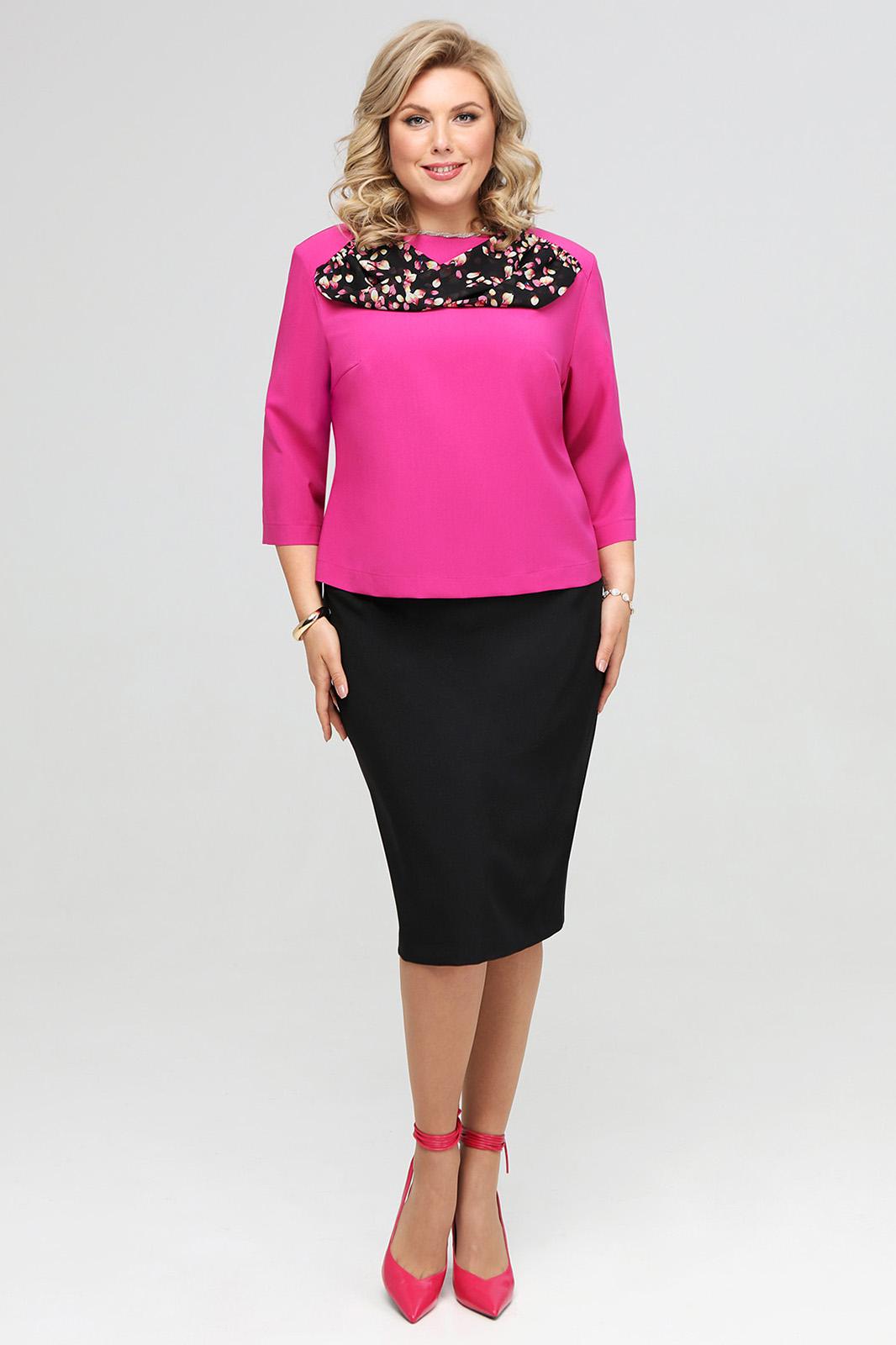 Комплект женский двухпредметный, состоящий из блузы и юбки «карандаш». Комплект выполнен из ткани костюмно-плательного ассортимента. Блуза полуприлегающего скользящего силуэта. Рукав втачной. Вырез горловины лодочка. По переду есть высокие кокетки в швы которых крепиться мягкий драпирующийся шарф из шифона с дизайном. Спинка имеет фигурный подрез, выходящий из горловины, с неглубоким разрезом с закругленными краями. Разрез фиксируются широкими завязками из шифона с дизайном, которые также служат декором. Длина изделия по спинке 62 см. Длина рукава 43 см. Юбка на притачном поясе, в который на участке спинки вставлена эластичная тесьма. На задней части юбки есть средний шов, в котором располагается застежка на потайную тесьма молнию, а по низу шва – шлица. Длина юбки по боковому шву от верха 69 см.