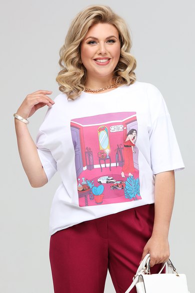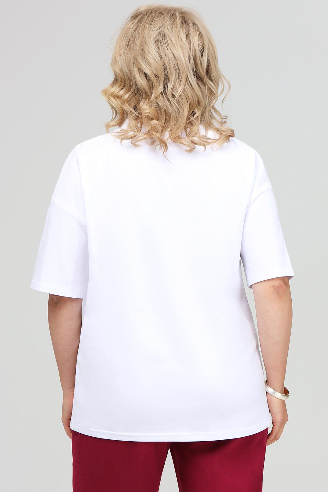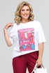 Футболка свободного силуэта со спущенной линией плеча. Является предметом базового гардероба. Выполнена из хлопкового трикотажа. Вырез горловины округлый, обработан узкой бейкой. Футболка декорирована печатью. Длина футболки по спинке 67 см. Длина рукава 31 см.
