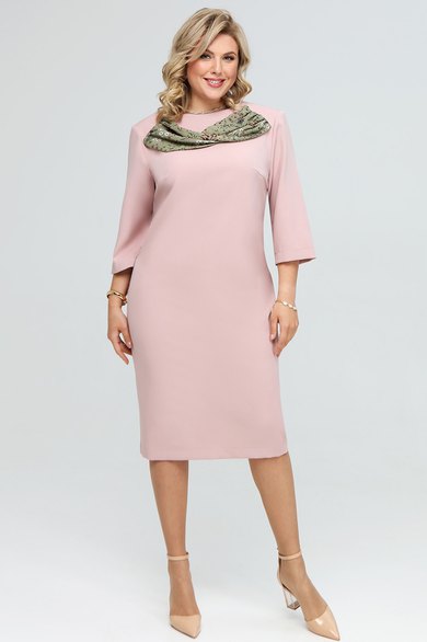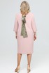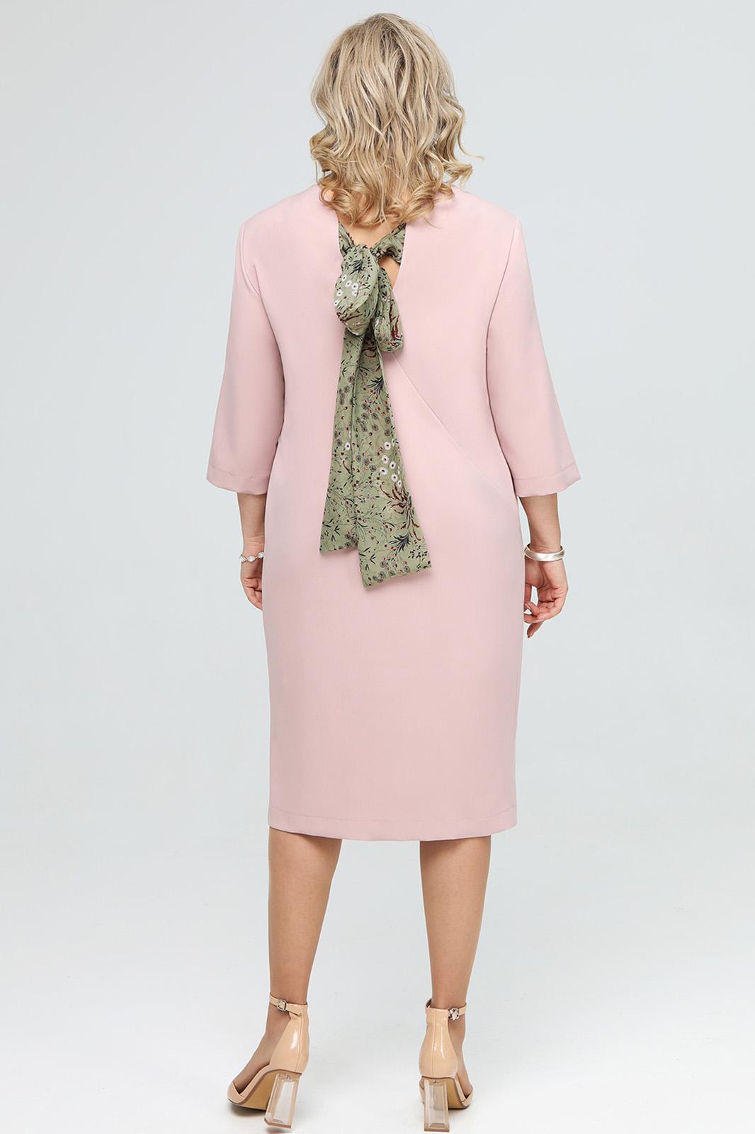 Женское платье прямого в области талии и слегка зауженного к низу силуэта, выполненное из ткани костюмно-плательного ассортимента. Рукав втачной. Вырез горловины лодочка. По переду есть высокие кокетки в швы которых крепиться мягкий драпирующийся шарф из шифона с дизайном. Спинка имеет фигурный подрез, выходящий из горловины, с неглубоким разрезом с закругленными краями. Разрез фиксируются широкими завязками из шифона с дизайном, которые также служат декором. В левом боковом шве по низу платья есть разрез. Длина изделия по спинке 112 см. Длина рукава 43 см.