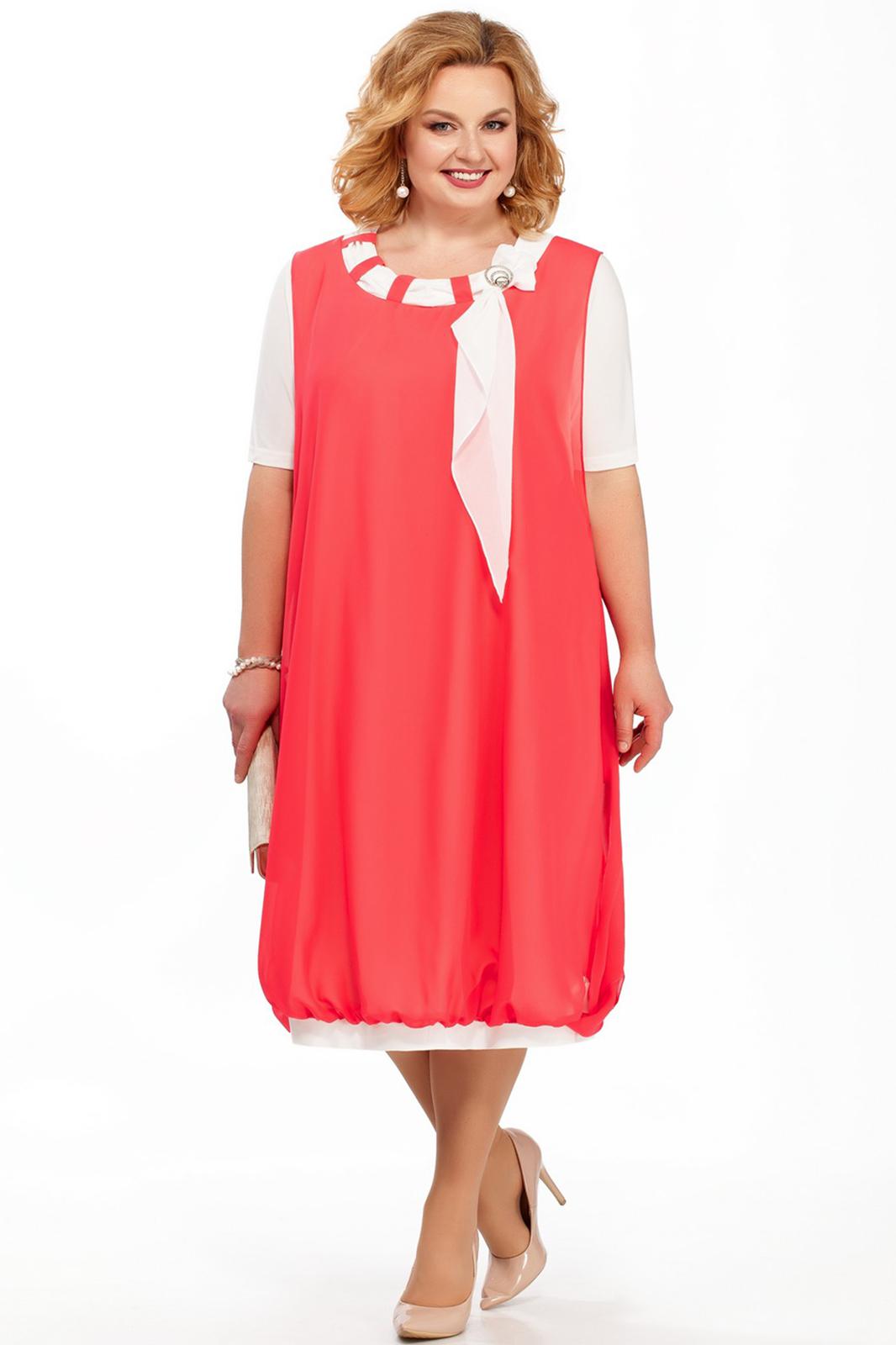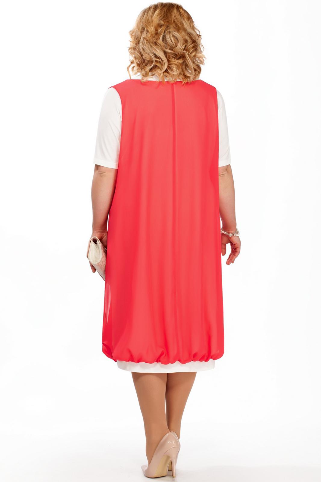 Платье, комбинированное из двух тканей. Нижнее платье из трикотажного полотна, с нагрудными вытачками и цельновыкроенными рукавами длиной 25 см. Округлая горловина переда и спинки обработана широкой обтачкой и декорирована спереди шифоновым шарфом, продетым через шлевки. Верхнее платье из шифона, присборено по низу на планках. Проймы глубокие, в боковых швах разрезы. Длина платья – 112 см