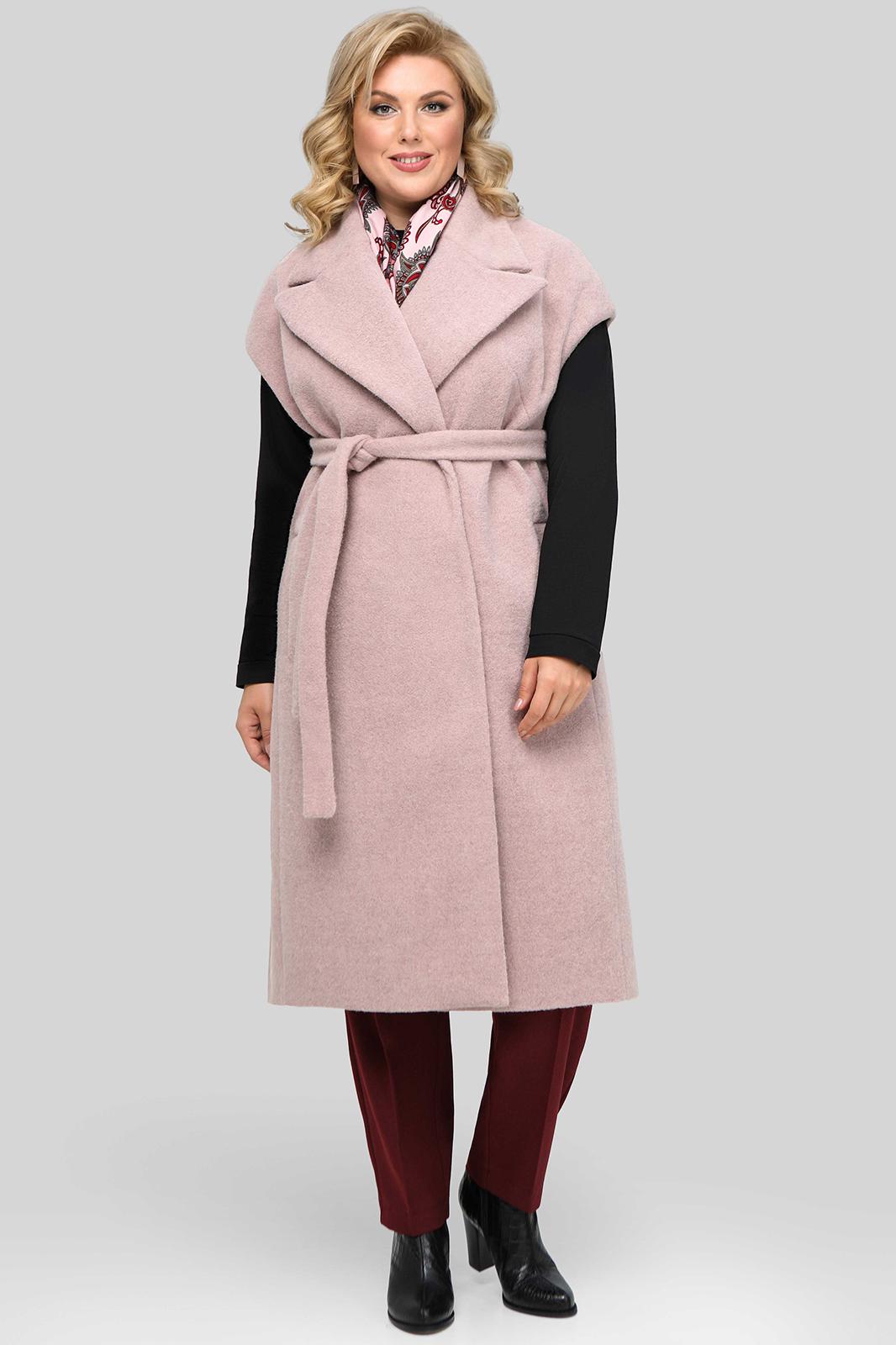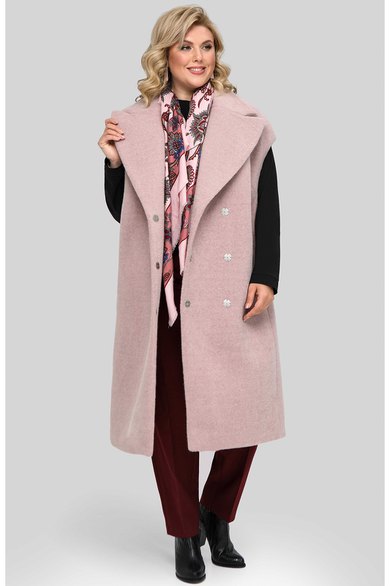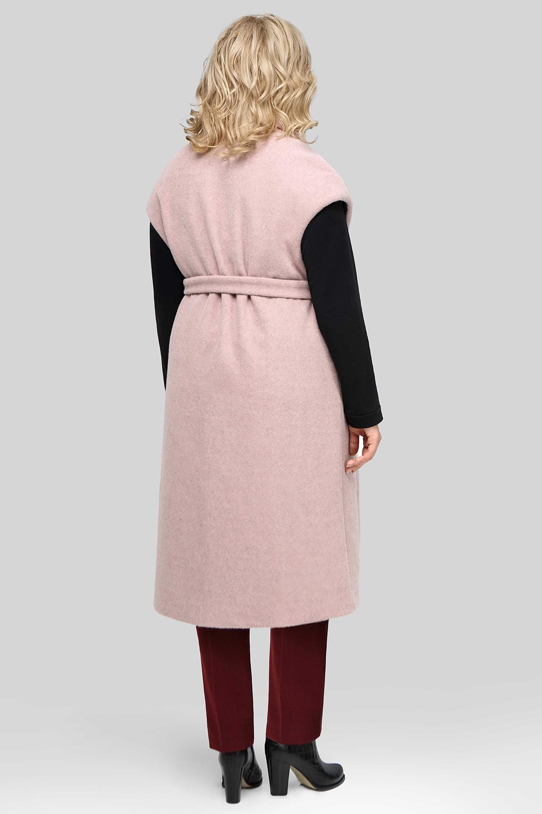 Женская жилетка прямого силуэта. Выполненная из пальтовой ткани. Застежка центральная двубортная на потайные кнопки. Воротник пиджачного типа с лацканами. Рукав втачной со спущенной линией плеча. По переду есть рельефные швы, в которых располагаются карманы с листочкой. Спинка со средним швом, по низу шва – шлица. Изделие на подкладке. Есть съемный мягко завязывающийся пояс. Длина изделия по спинке 112 см.