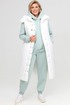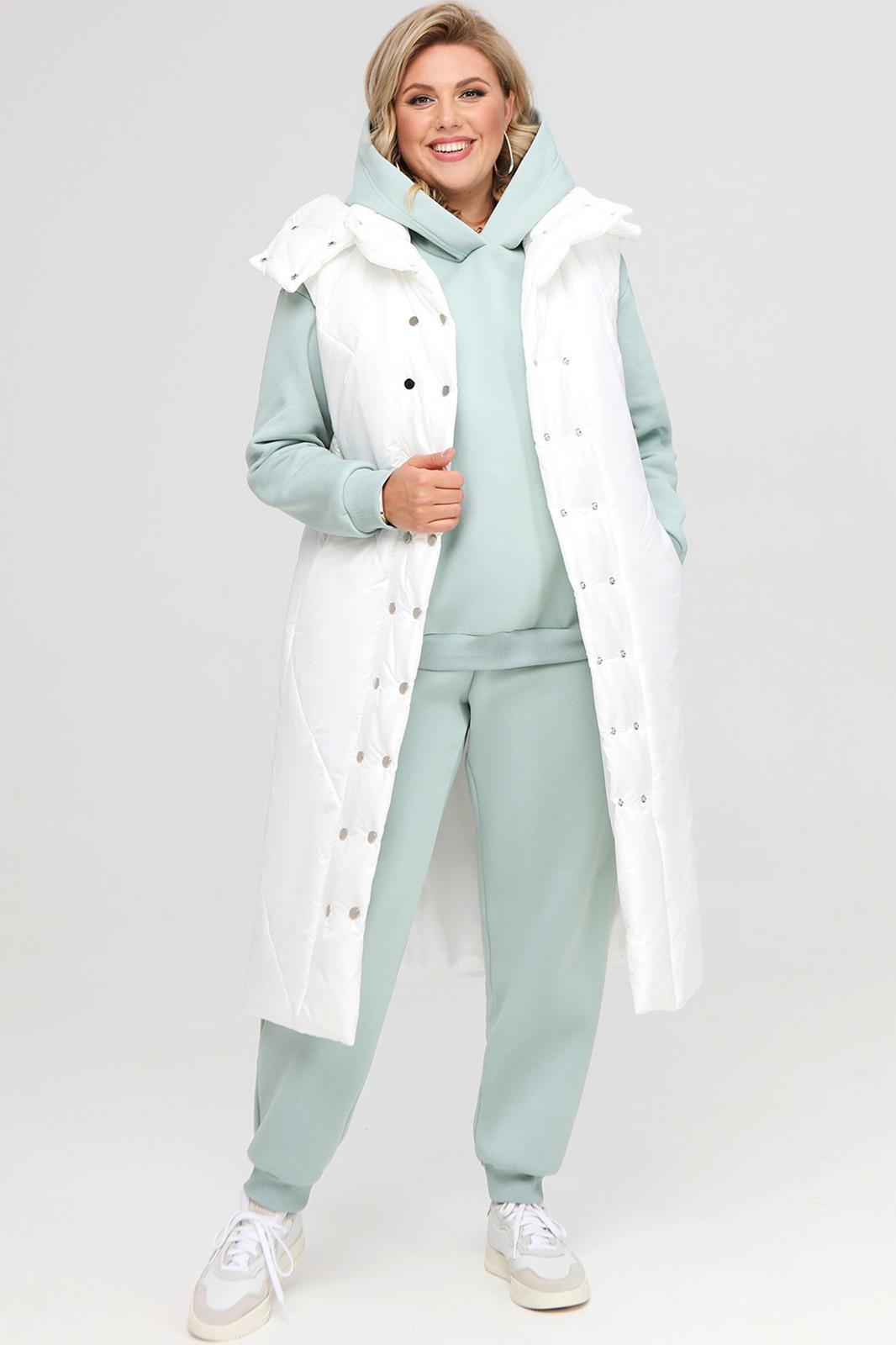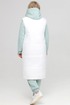 Удлиненная женская жилетка прямого силуэта, выполненная из плащевой ткани на тонком синтепоне. Изделие на подкладке. Детали переда имеют широкую наклонную стежку, спинка и бочки имеют широкую горизонтальную стежку. По переду есть смещенные рельефные швы, в которых располагаются карманы. Застежка на широкую планку с двойным рядом пробивных кнопок. Воротник – высокая стойка. Есть съемный капюшон. Длина изделия по спинке от шва втачивания воротника в горловину 114 см.