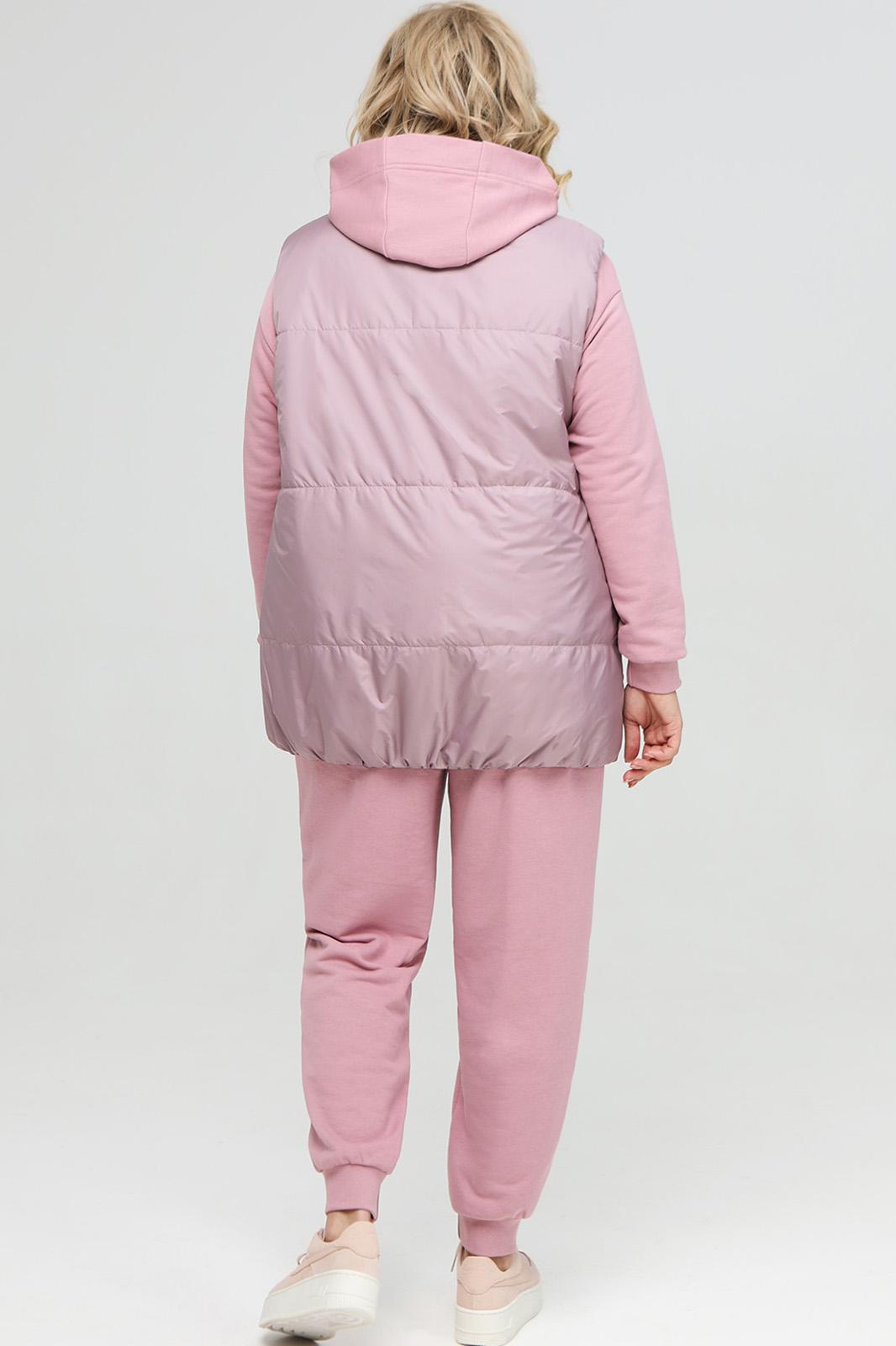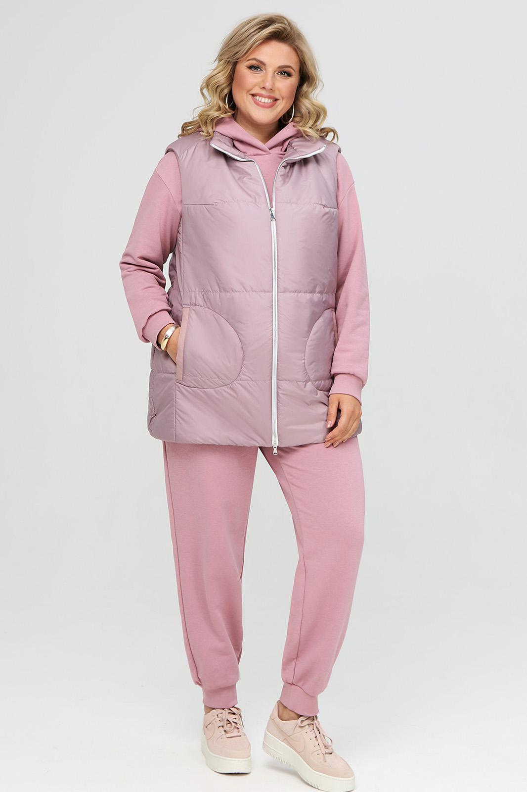 Женская жилетка овального силуэта. Выполненная из плащевой ткани на тонком синтепоне с крупной горизонтальной стежкой. Изделие на подкладке. По переду есть смещенные рельефные швы, в которых располагаются карманы. Линия входа в карман декорирована настрочной тесьмой в цвет основной ткани. Конфигурация кармана полукруглая и подчеркнута декоративной отстрочкой. Застежка на металлическую тесьму-молнию. Воротник стойка. Воротник декорирован настрочной тесьмой по средней линии, параллельной линии отлета воротника. Тесьма также имеет цвет основного материала. Нижняя часть спинки с эластичной тесьмой в подгибке, что создает желаемый силуэт и помогает регулировать обхват бедер. Длина изделия по спинке от шва втачивания воротника в горловину 75 см.