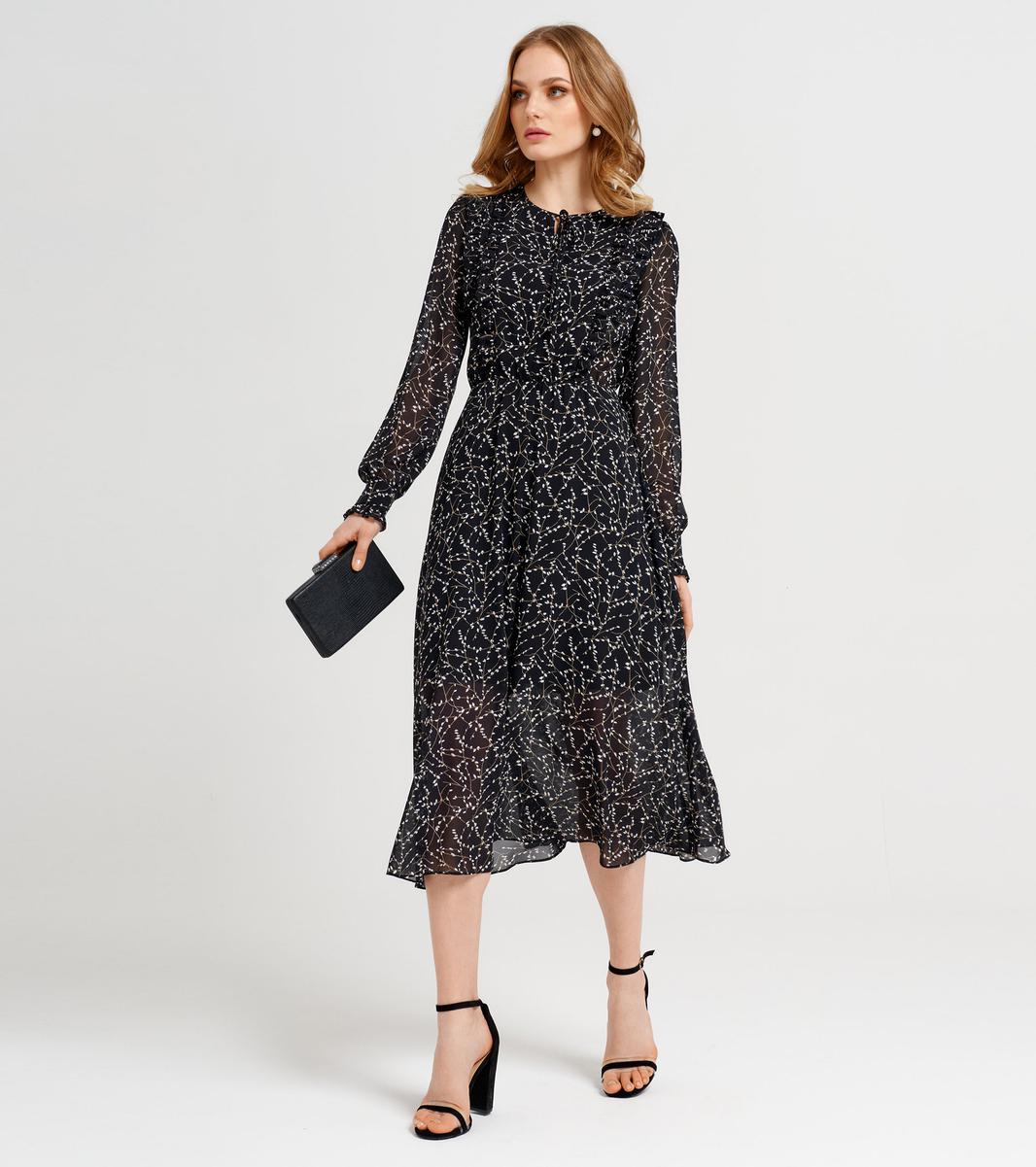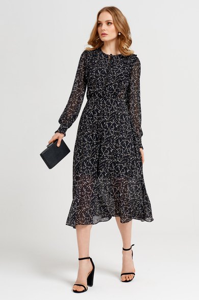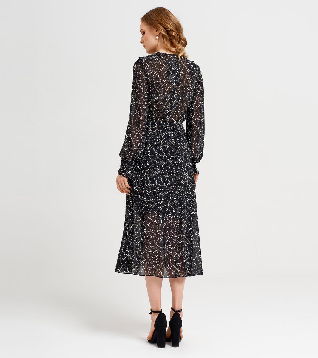 Нарядное платье из шифона в нежный принт. Платье длиной миди, без воротника, с овальным вырезом горловины. По переду вырез «капелька», с завязками. По переду в рельеф пройму и отрезной бочок вставлена рюша. Рукав длинный, с манжетой. По нижнему срезу манжеты рюша. Платье отрезное по линии талии, со сборкой на резинку. Застежка на потайную молнию в боковом шве.