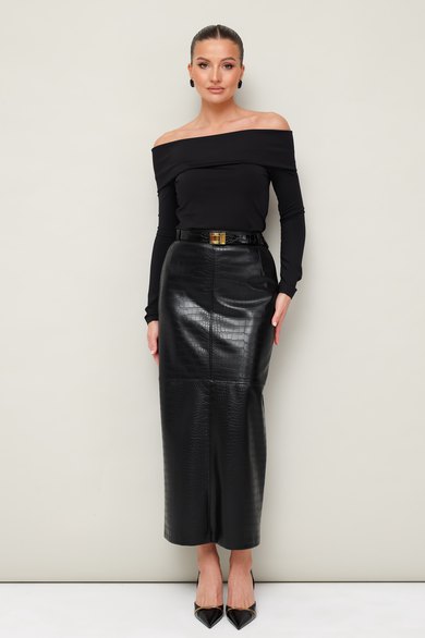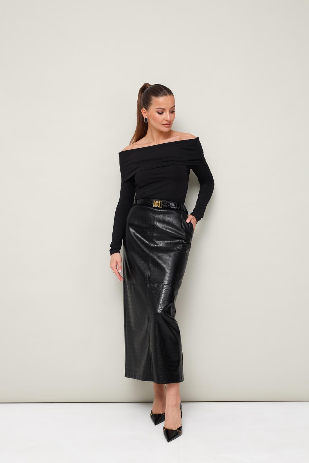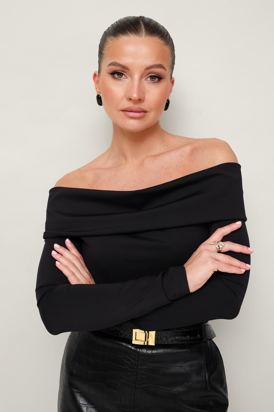 Блуза с открытыми плечами прилегающего силуэта, выполнен из эластичного полотна - бифлекс. По верхнему срезу обработан широкий отворот.