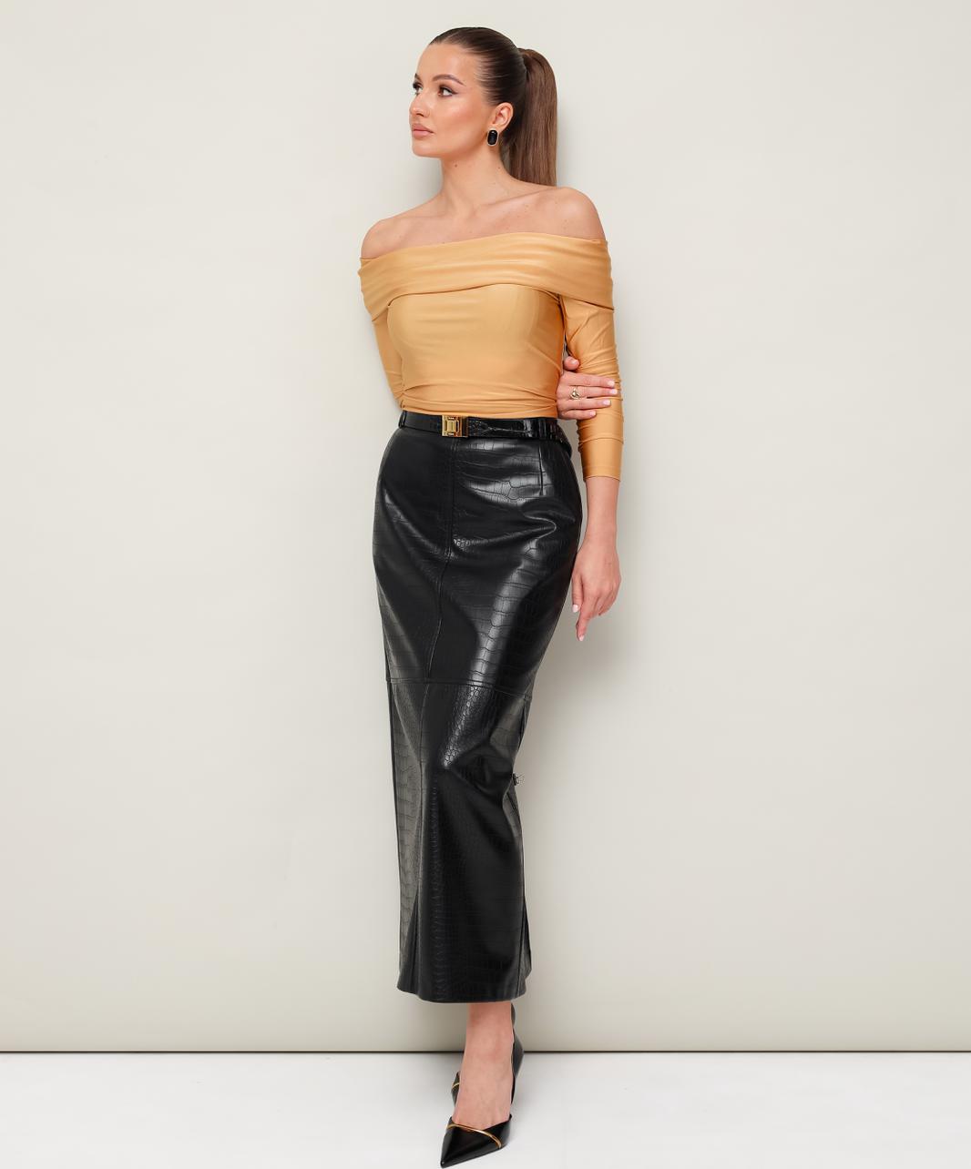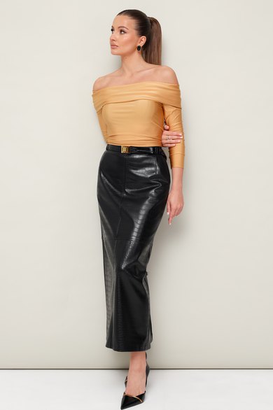 Блуза с открытыми плечами прилегающего силуэта, выполнен из эластичного полотна - бифлекс. По верхнему срезу обработан широкий отворот.