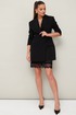 Силуэтное платье-жакет прилегающего кроя, выполнено из качественной костюмной ткани. Воротник пиджачного типа с отложными лацканами. Двубортная застежка на петли и обтяжные пуговицы. Спереди обработаны прорезные карманы в рамку с клапанами и нагрудный прорезной карман с листочкой. Рукава втачные, двухшовные с отлетными шлицами и обтяжными пуговицами. Спинка с рельефами и средним швом. Платье-жакет на подкладке.Юбка в бельевом стиле в длине мини, выполнена из струящейся ткани с матовым блеском. Пояс с кружевной отделкой обработан резинкой для комфорта и регуляции размера. Низ юбки декорирован кружевом.