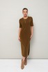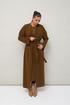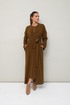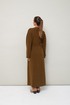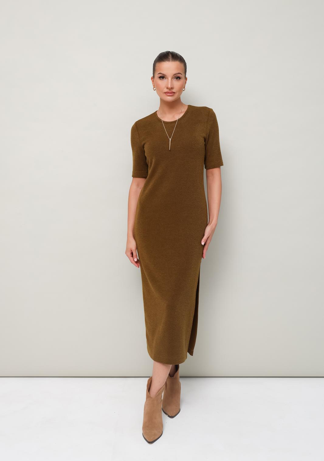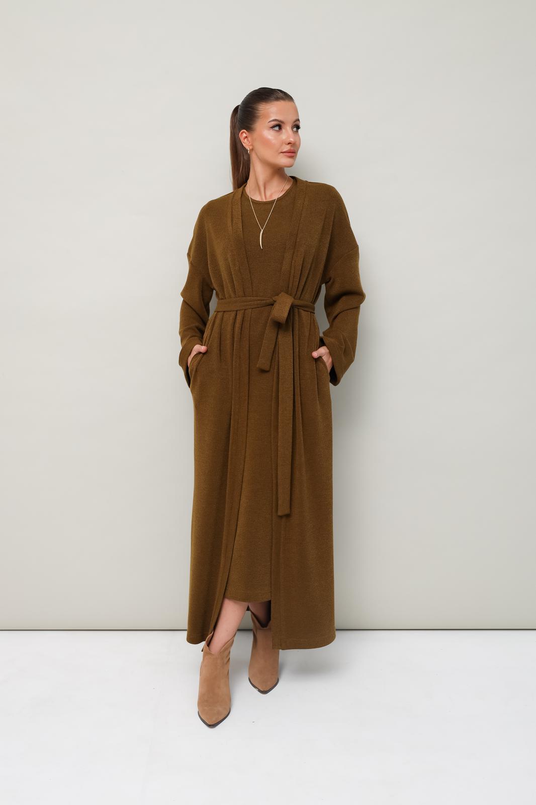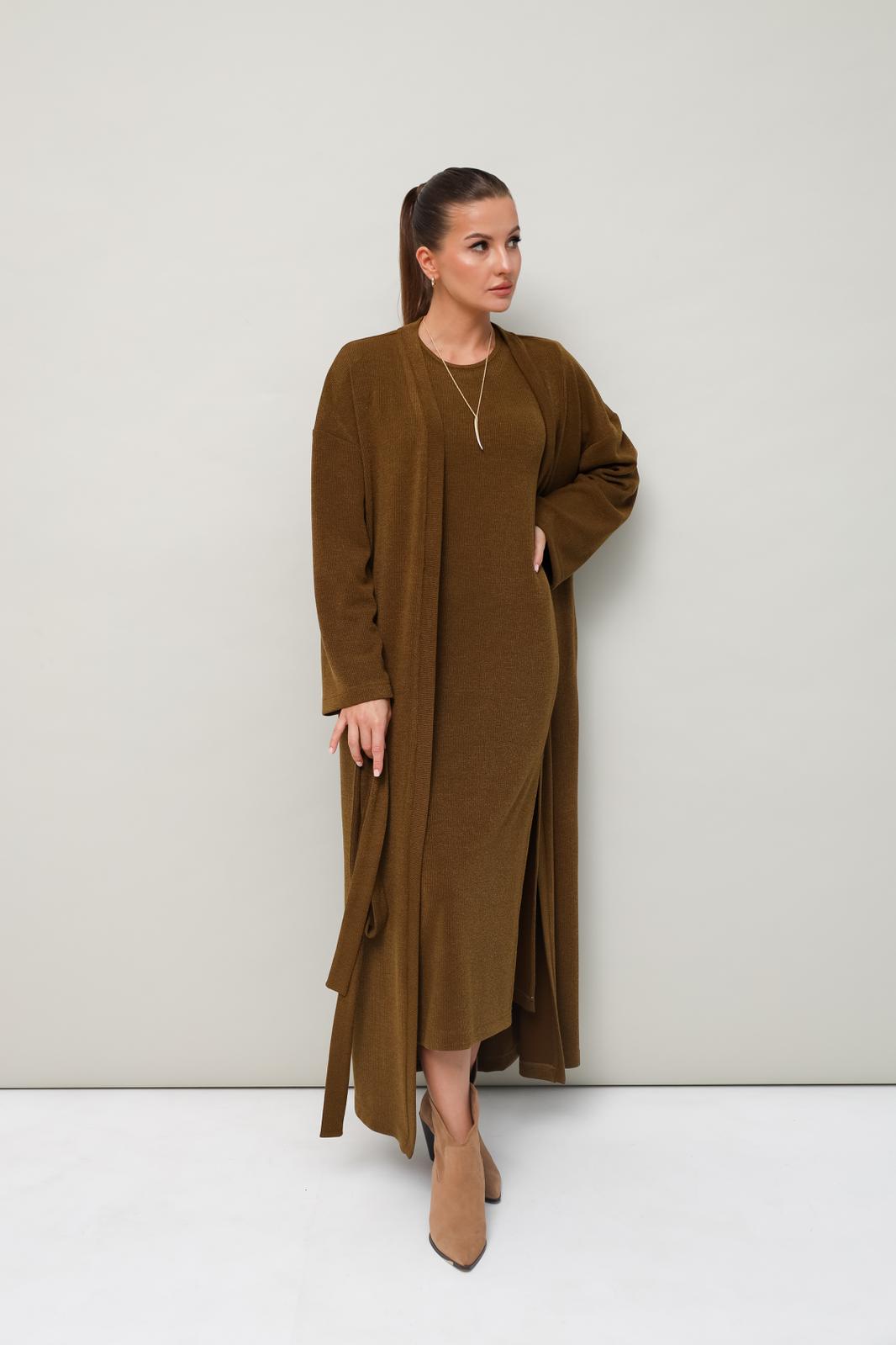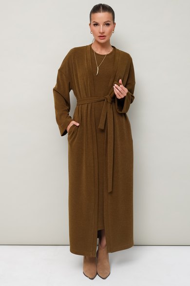 Женский комплект, состоящий из кардигана и платья, выполнен из мягкого уютного трикотажного полотна. Горловина спинки и борта обработаны притачной планкой. Длинные рукава со спущенной линией втачивания плеча. В боковых швах внутренние карманы. Трикотажное платье полуприлегающего силуэта в длине миди. Округлый вырез горловины. Рукава втачные в длине до локтя. В левом боковом шве обработан высокий разрез. В комплекте прилагается пояс из основной ткани.